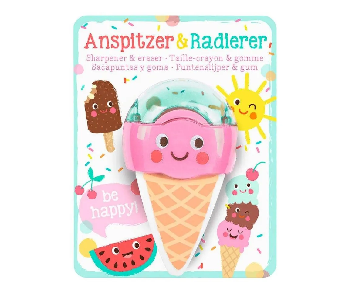 Original sacapuntas con forma de helado con goma extraíble. Será el complemento que no podrá faltar en ningún estuche escolar.