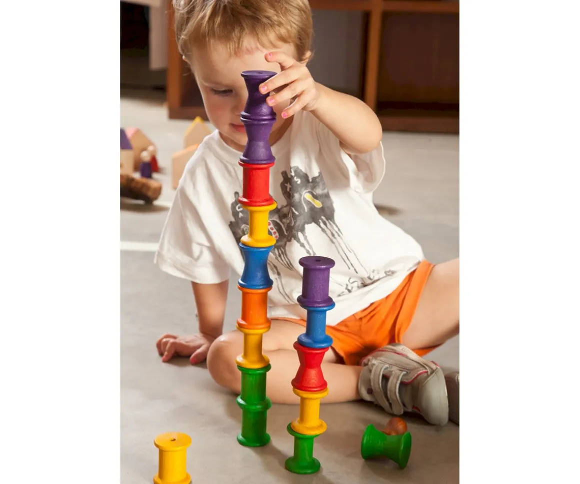 Juego que favorece el pensamiento lógico-matemático y las destrezas motrices. El tipo de elemento permite apilar, hacerlo rodar… generando otras propuestas de juego.