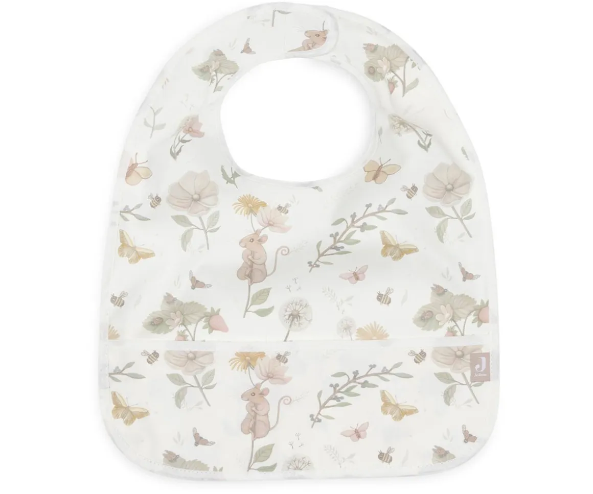 Set de 2 baberos de la colección Dreamy Mouse de Jollein con bolsillo recogemigas en la parte delantera y que se ajustan cómodamente al cuello del bebé mediante velcro en la parte posterior.