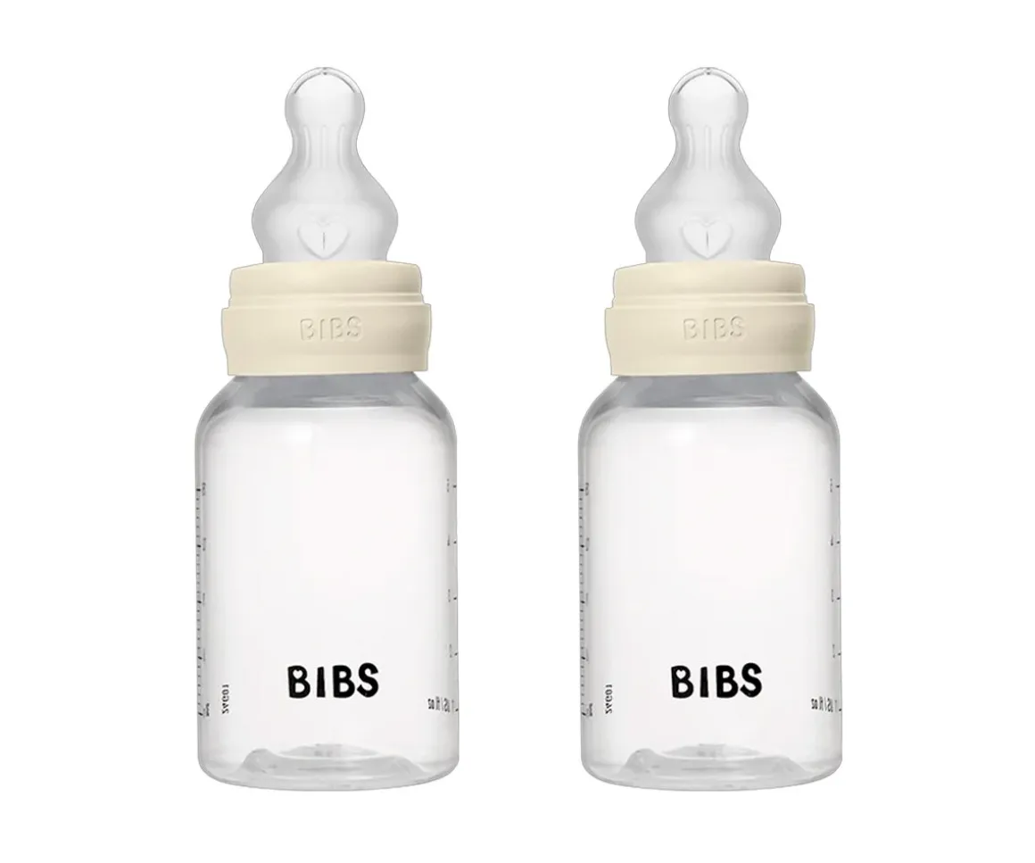Pack de 2 biberones BIBS con botella de plástico, más ligero y fácil de sujetar, de 150 ml de capacidad que es compatible con todos los accesorios para biberones de la marca.