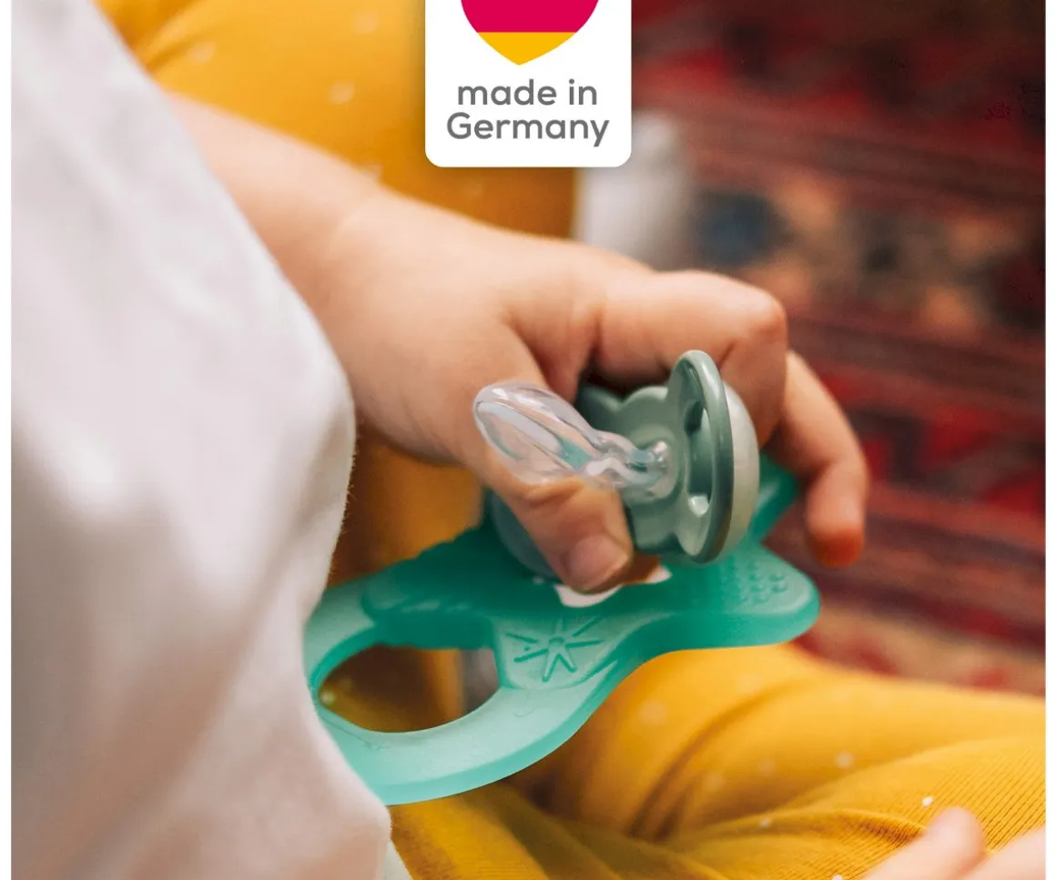 - Tetina anatómica silicona con paso dental que previene la desalineación de los dientes con forma de cuchara que garantiza la libertad de la lengua