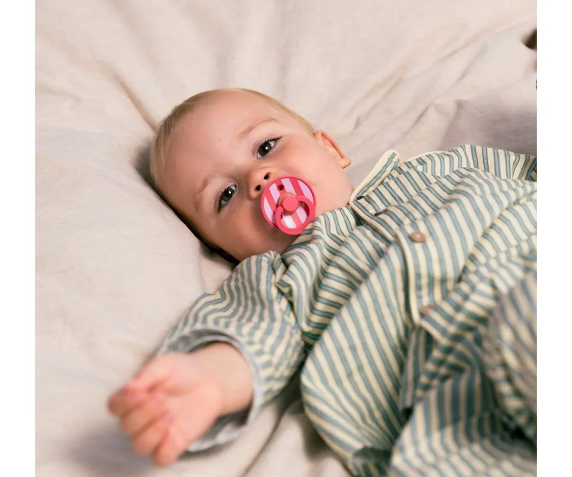 - Simétrica: También llamada fisiológica. Promueve una técnica de succión donde la lengua está plana y presiona el chupete contra el paladar por lo que el bebé no necesita succionar tan fuerte