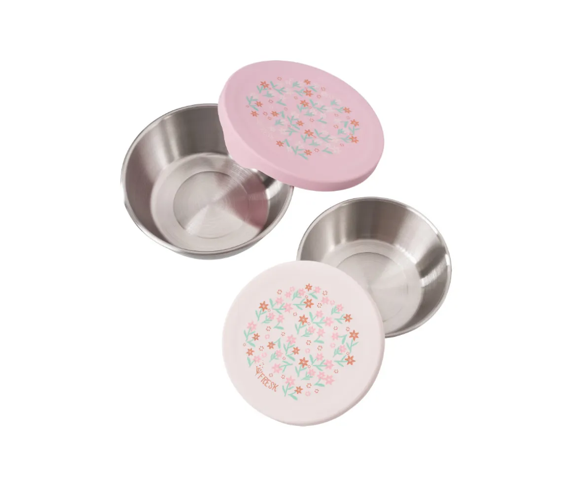 El Snackbox Pack de 2 Flores de Fresk es la solución perfecta para llevar snacks de forma práctica, segura y sostenible. Este set incluye dos recipientes redondos de acero inoxidable, resistentes, ligeros y muy duraderos, acompañados de tapas de silicona de alta calidad que garantizan un cierre seguro y sin fugas (no aptos para líquidos).