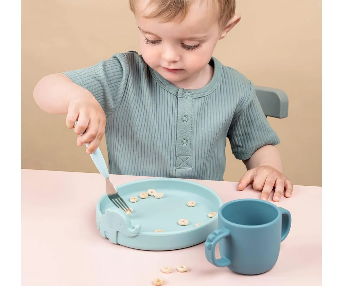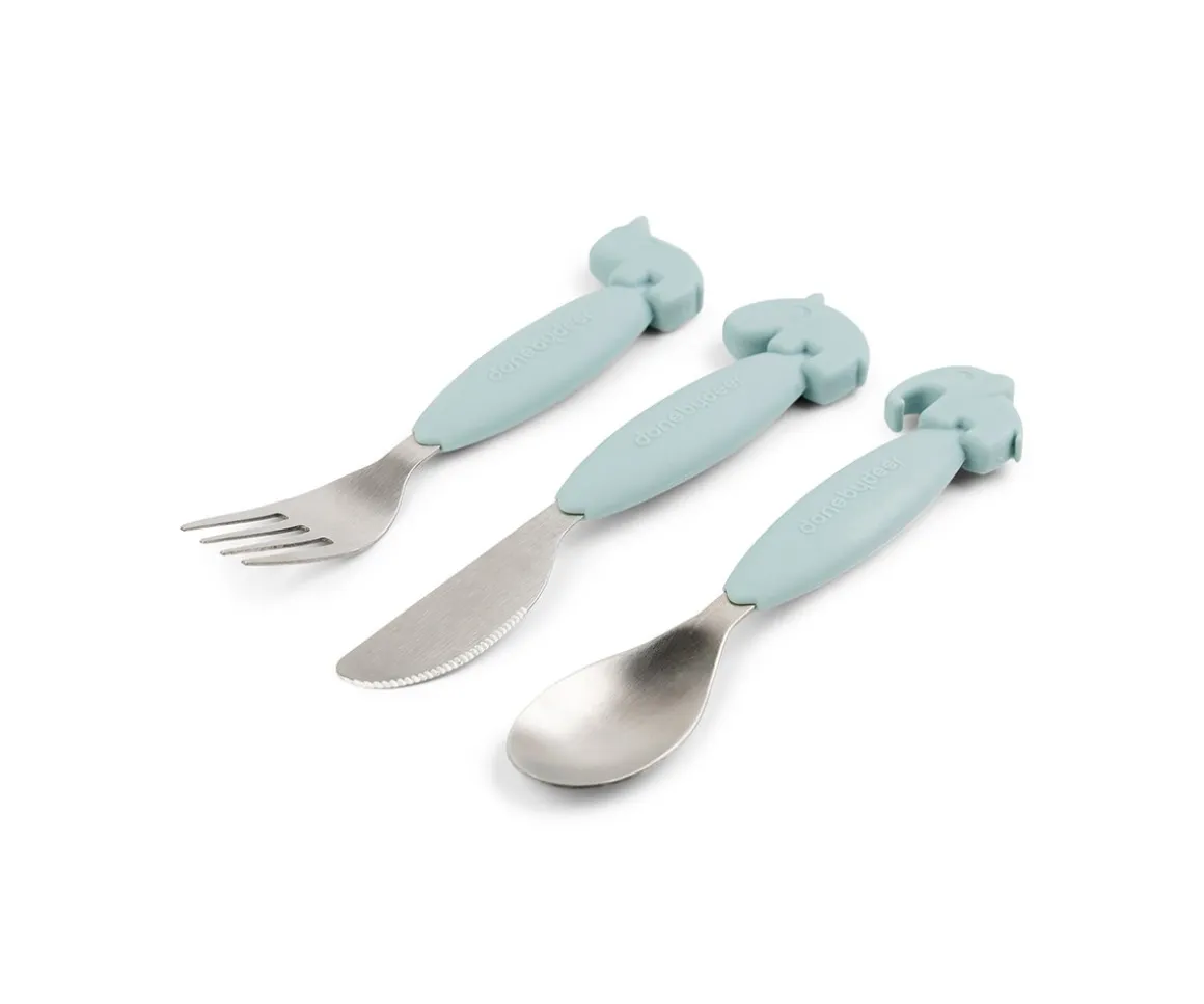Set de cubiertos compuestos con cuchara, cuhillo y tenedor de silicona para un sencillo agarre para manos más pequeñas