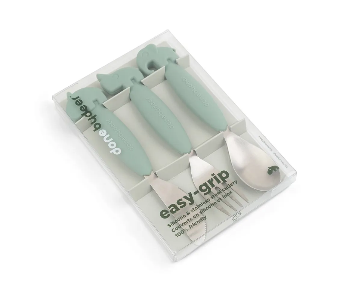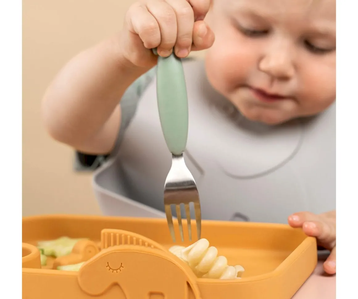 Set de cubiertos compuestos con cuchara, cuhillo y tenedor de silicona para un sencillo agarre para manos más pequeñas