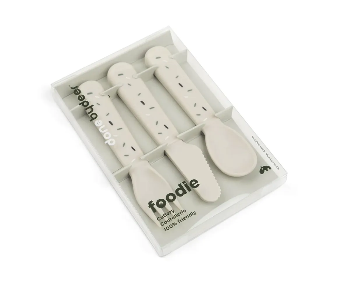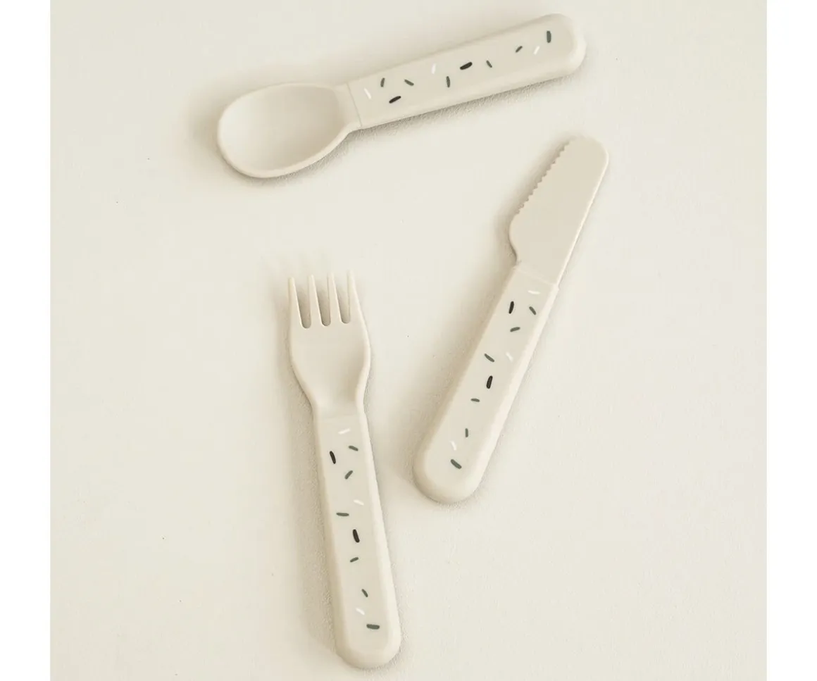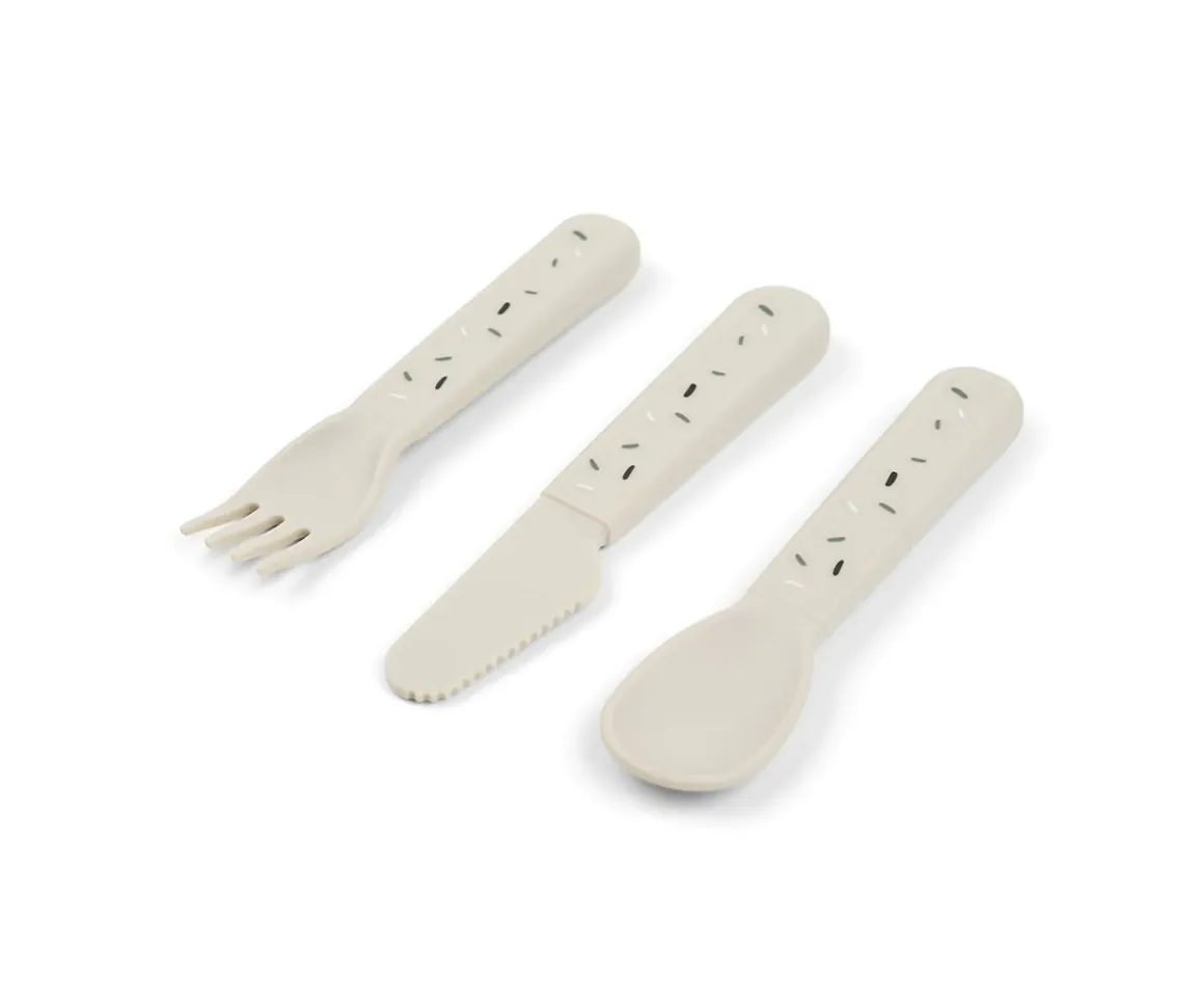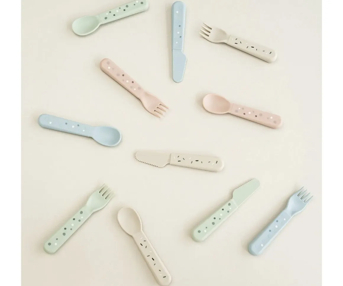 El juego de cubiertos Cutlery tiene formas redondeadas para que los niños pequeños practiquen comiendo solos de manera segura. Los cubiertos están diseñados para manos pequeñas y han sido probados por niños.