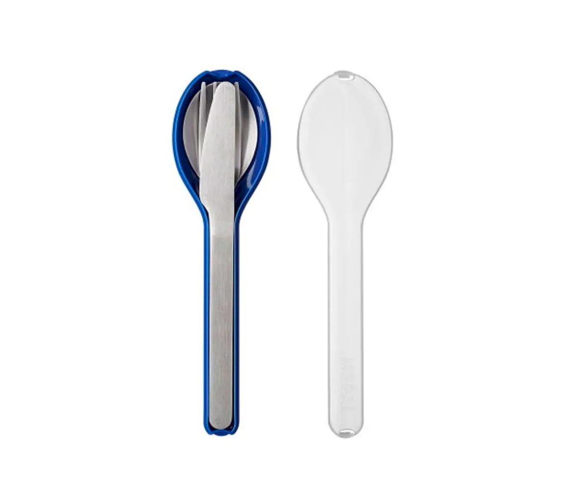 Este práctico set de cubiertos consta de un cuchillo, un tenedor y una cuchara unidos por un soporte de plástico.