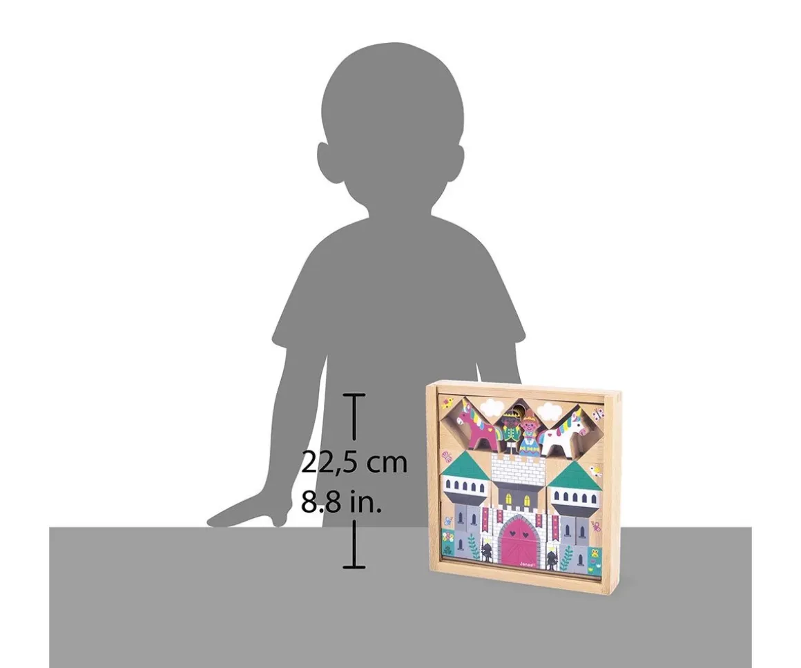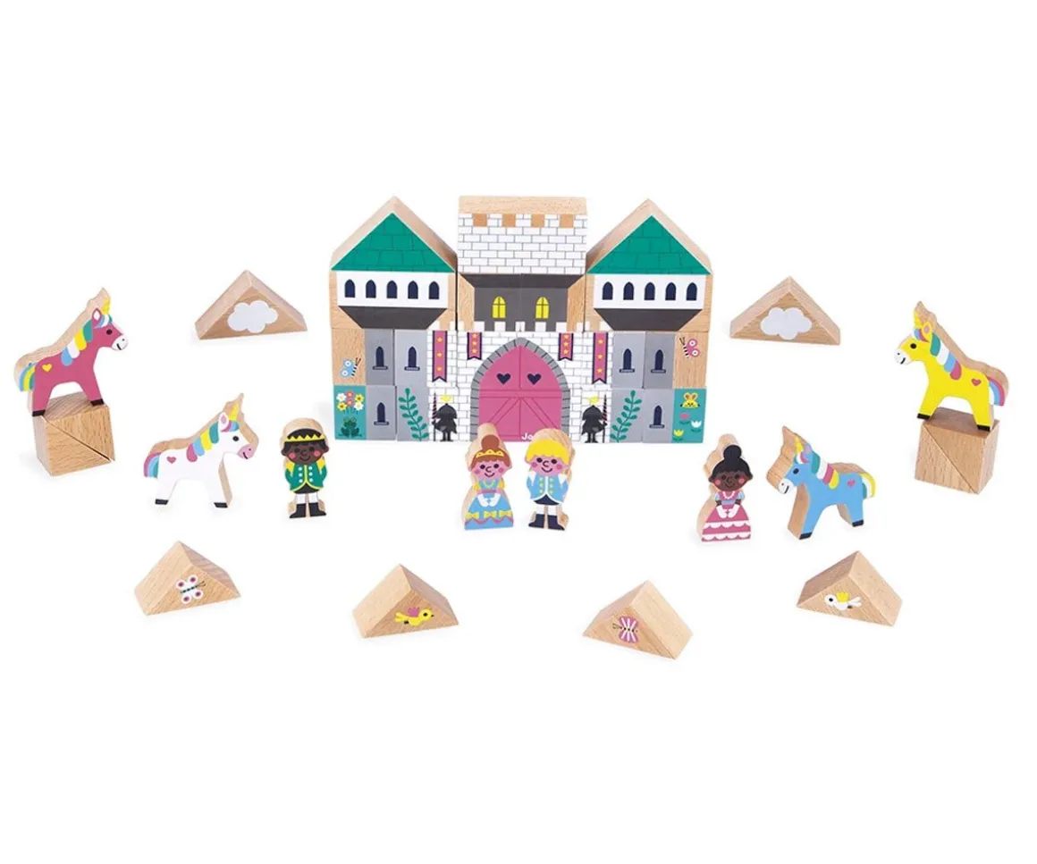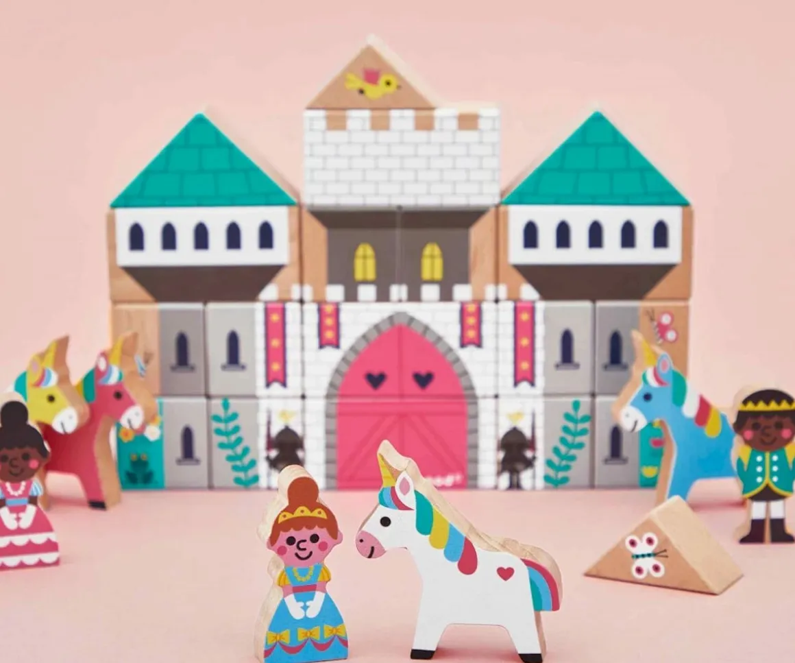 Se trata de 37 bloques de madera con diferentes formas y decoraciones pintadas entre los que encontrarás 29 cubos para montar un castillo y decorar sus alrededores, 4 personajes y 4 unicornios.