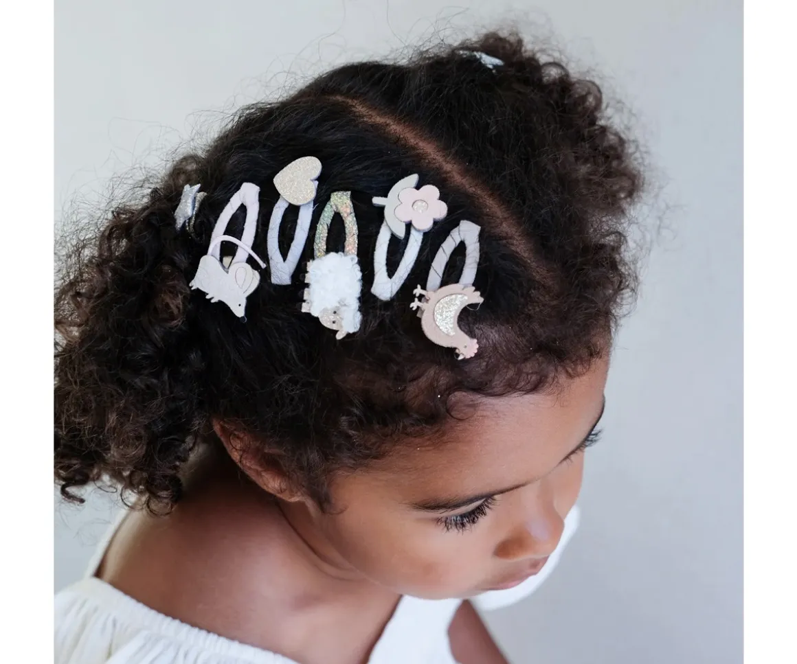 Adorables clips de pelo decorados con animalitos de granja que permanecerán en el pelo de tu peque durante todo el día y le mantendrán el cabello recogido.