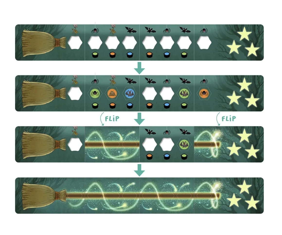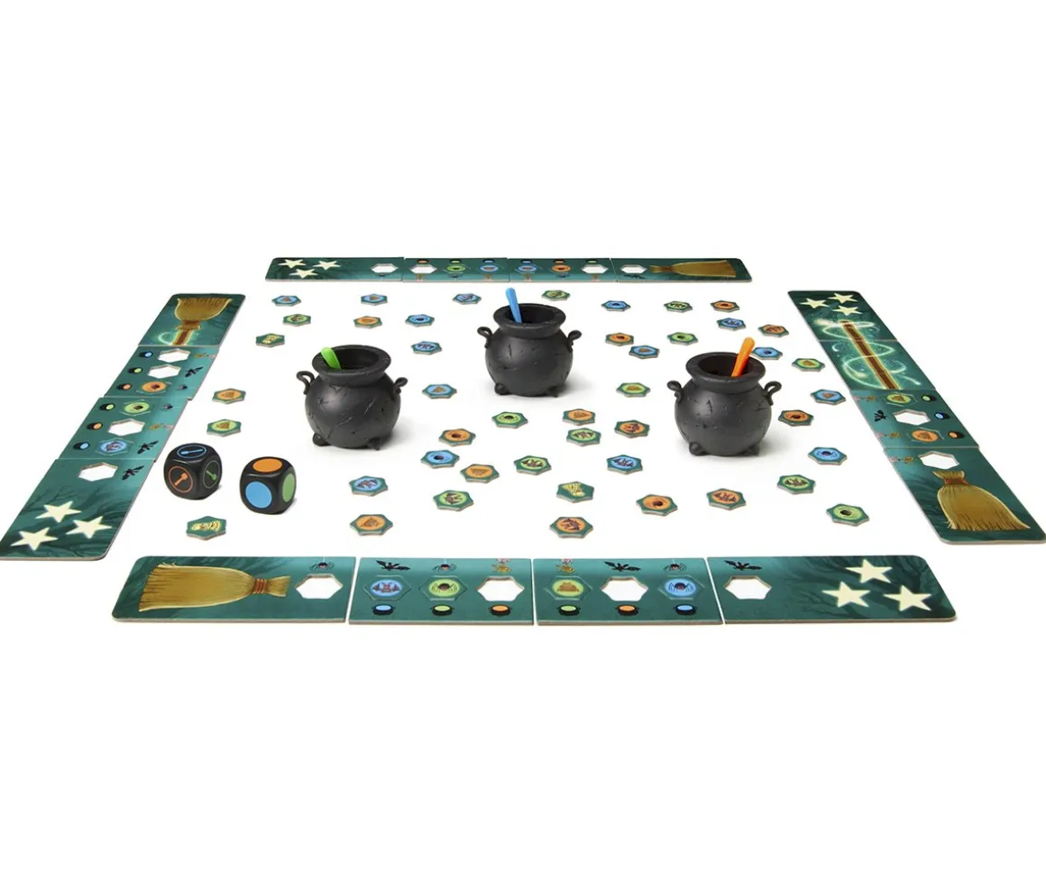 - Incluye: 3 calderos mágicos, 3 cucharas de colores, 2 dados (1 dado de color, 1 dado de acción), 6 tarjetas de «cepillo» de escoba, 6 tarjetas de «extremo del palo» de escoba con 3 estrellas, 18 tarjetas de ingredientes/escoba, 63 fichas de ingredientes/escoba, 3 fichas de serpiente y reglas del juego