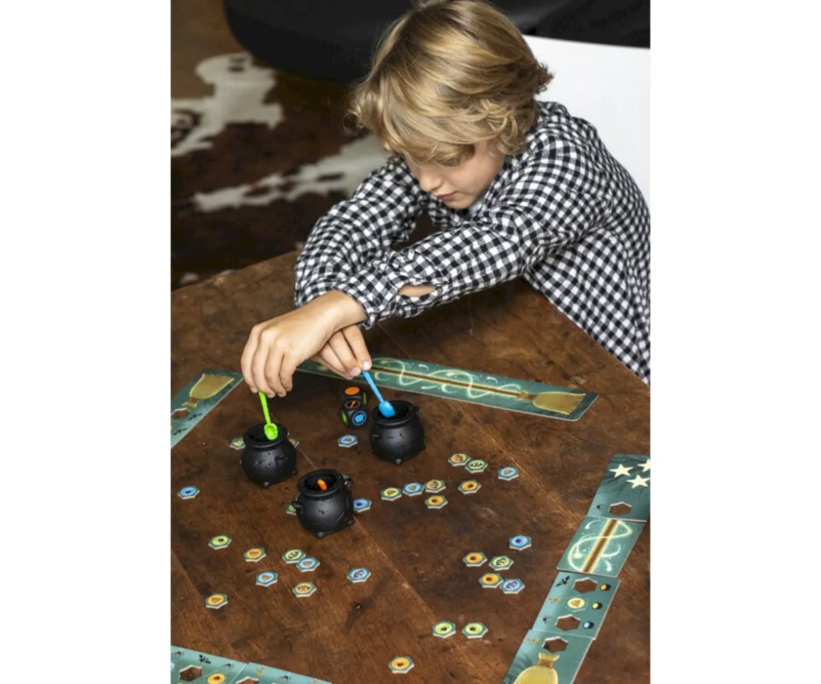 ¡Divertido, mágico y explosivo! Abracada-Broom es un juego de memoria lleno de “giros” para toda la familia. Vuelve a hacer magia con tu escoba preparando las mezclas adecuadas mientras las ollas y las cucharas vuelan por todas partes. ¡ATENCIÓN! ¡Demasiados ingredientes harán que tu caldero explote!