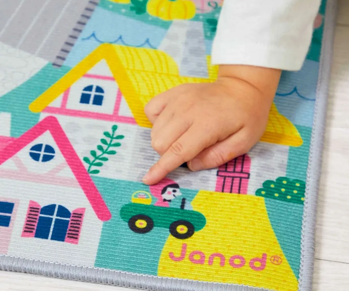 Las alfombras de juegos con circuito de la colección Cross Roads de Janod están repletas de carreteras, elementos divertidos como animales, casas y mucho más.