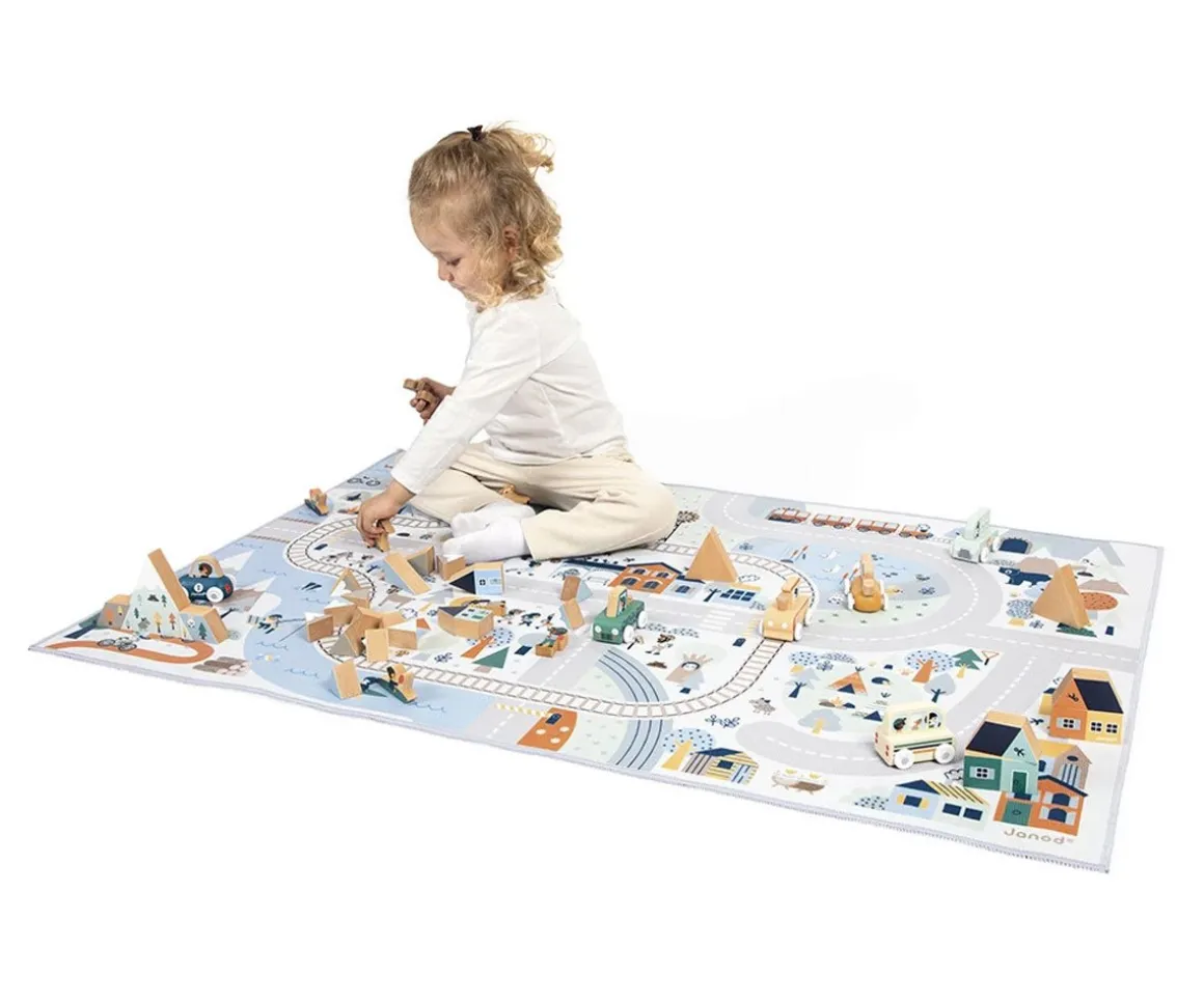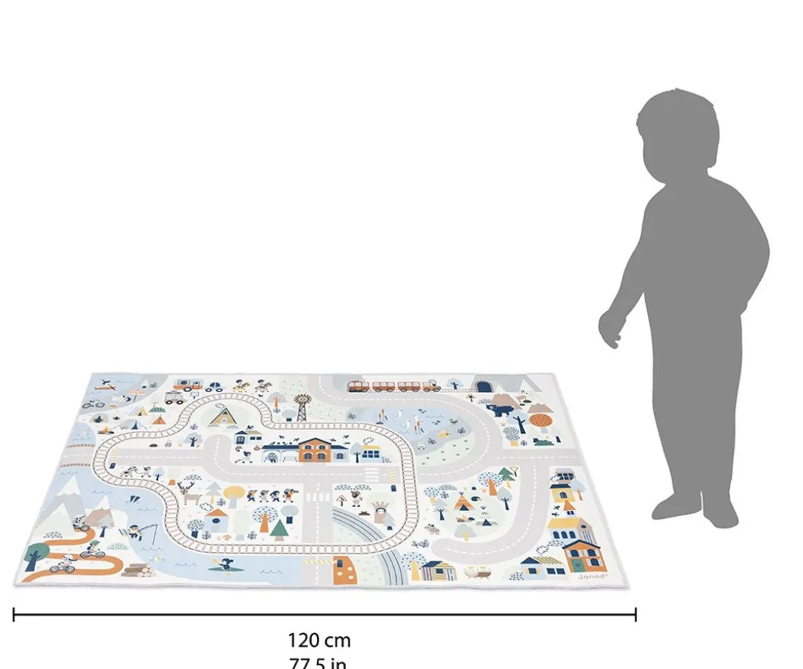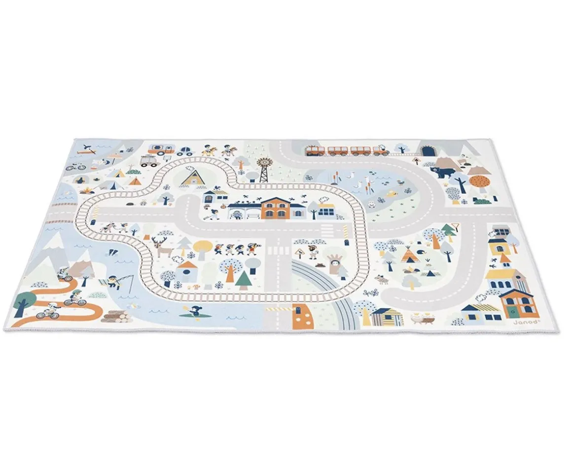 Las alfombras de juegos con circuito de la colección Cross Roads de Janod están repletas de carreteras, elementos divertidos como animales, casas y mucho más.