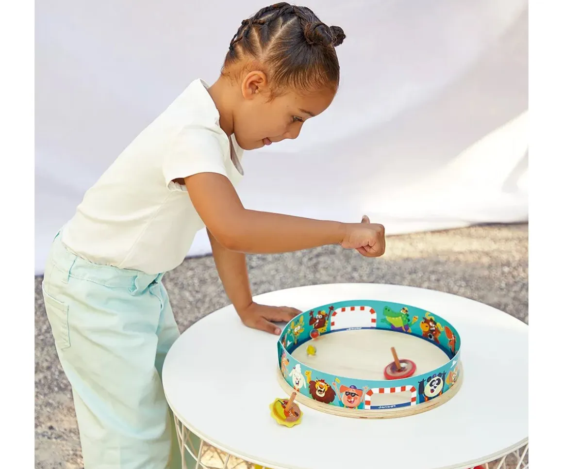 ¡Prepárate para la diversión con el emocionante juego de destreza de peonzas de Janod! En este juego, el objetivo es meter la canica en la portería del rival utilizando la peonza como herramienta de juego.