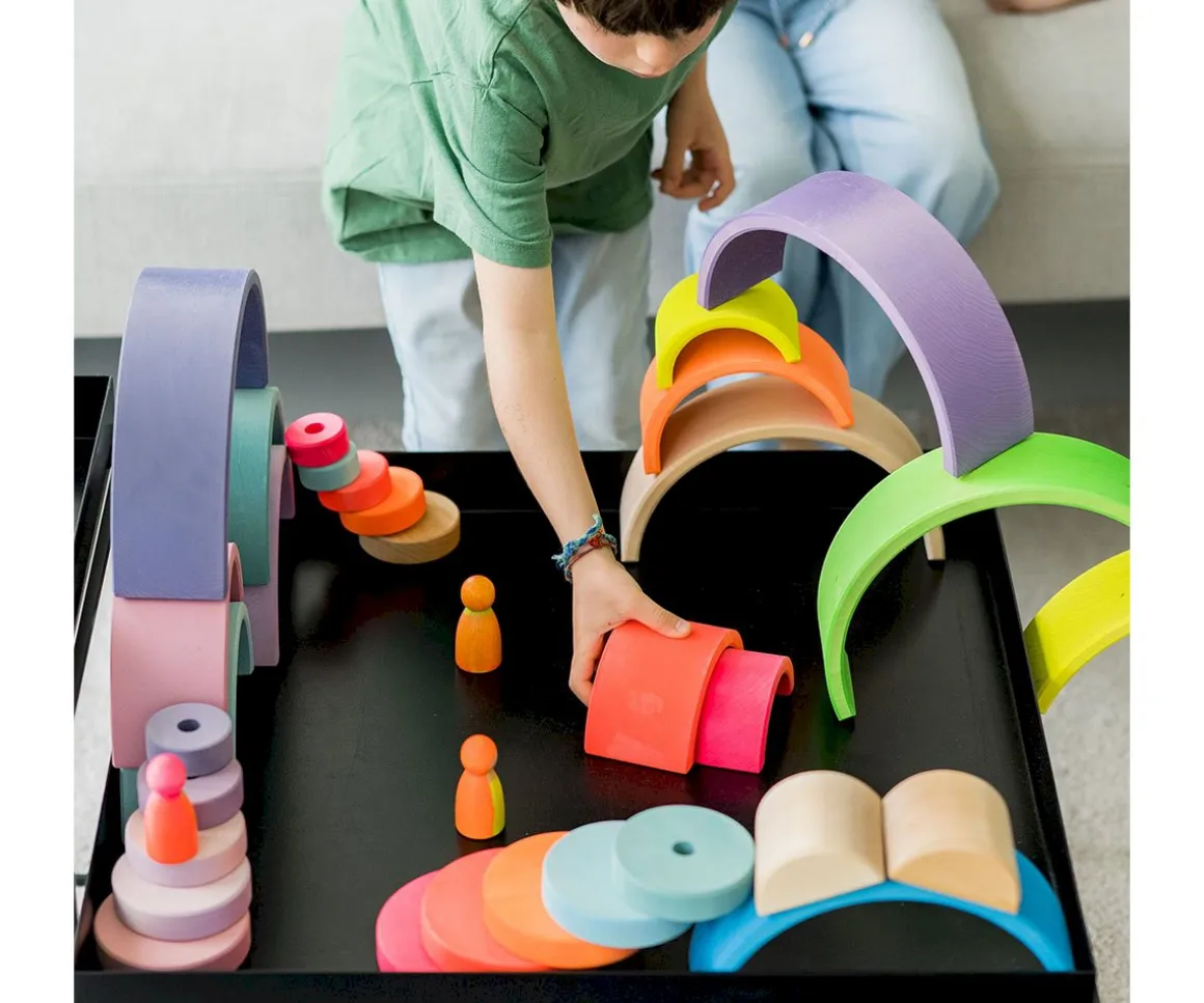 Con el arcoíris tendrán múltiples posibilidades para jugar y transformarlo en lo que ellos quieran: un tunel, un puente, una cuna de muñecas, apilables y mucho más.