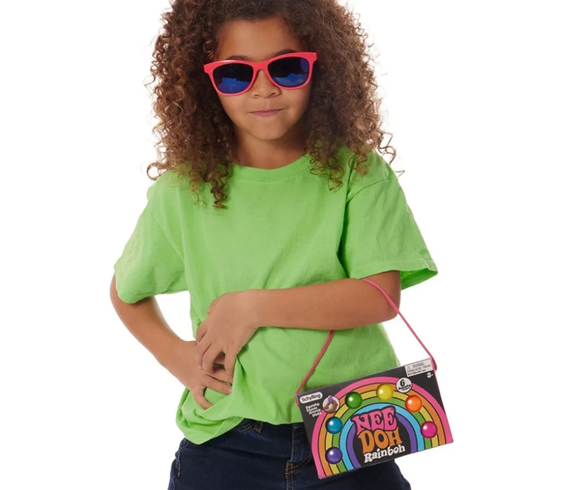 6 bolas blanditas con los colores del arcoiris, presentadas en una cajita con ventanas y un asa de cordón, perfectas para compartir y pasar momentos de diversión y entretenimiento con familiares y amigos.