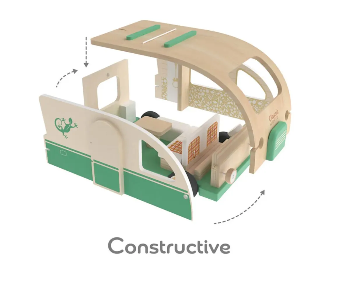 - Incluye: autocaravana,tabla de surf,3 figuritas de madera (papá, mamá e hijo)