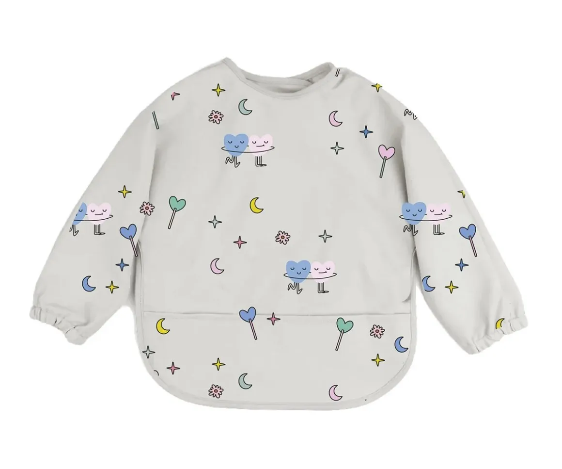 Divertido babero con mangas de la marca The Cotton Cloud. Es versátil, perfecto para la hora de la comida o para realizar manualidades. Con material impermeable y un práctico bolsillo recoge migas lo hace indispensable para proteger la ropa de los peques.