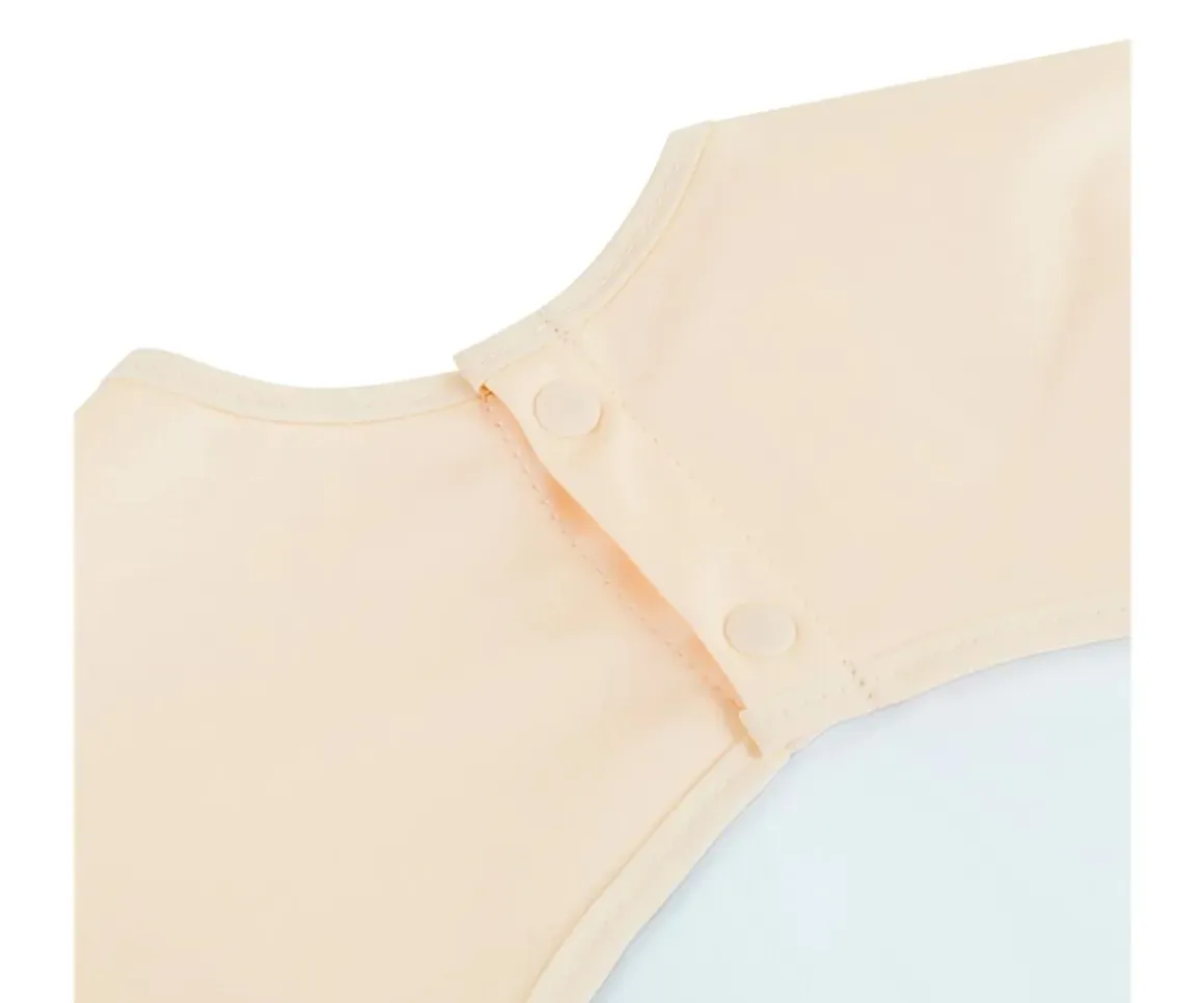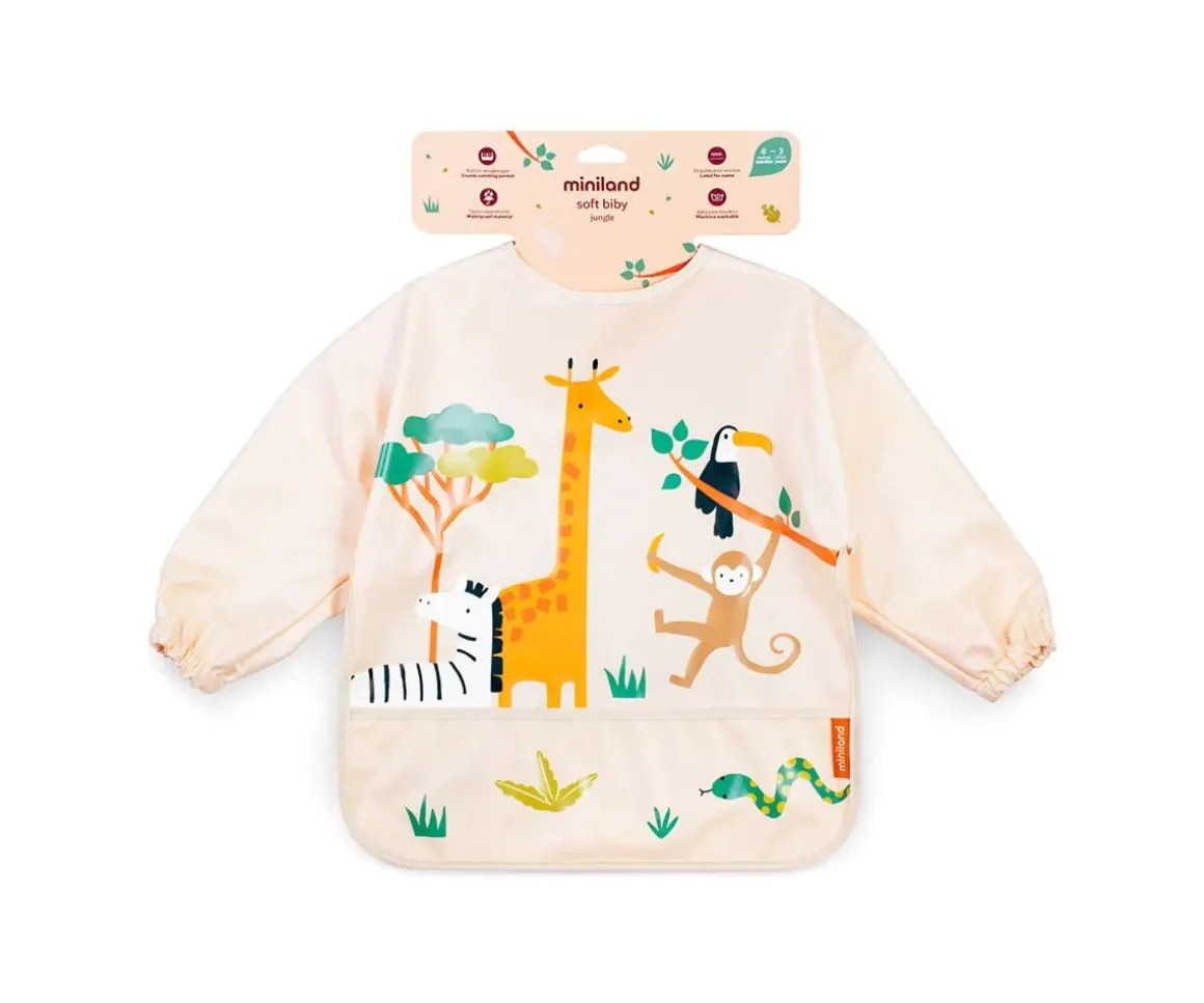 Divertido babero con mangas Jungle de Miniland. ¡Perfecto para la hora de la comida o para realizar manualidades! Con material impermeable y un práctico bolsillo recoge migas, lo hace indispensable para proteger la ropa de los peques.
