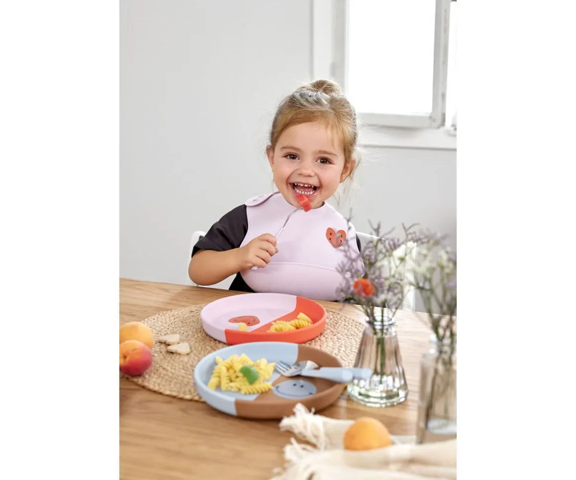 Babero de silicona con un bolsillo recogemigas para evitar que caiga la comida a la ropa.