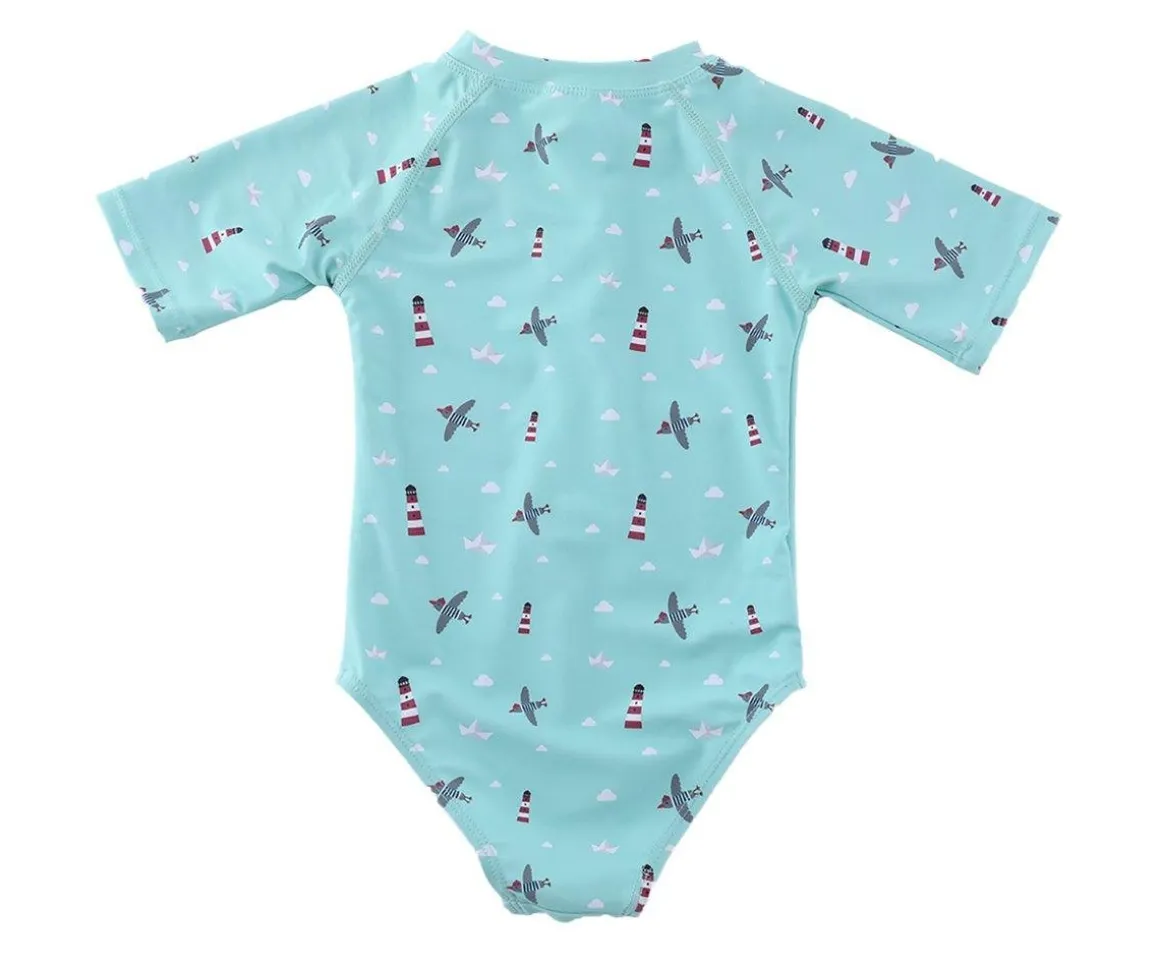 Bañador con cremallera delantera de la colección Lighthouse de Monnëka que ha sido creado con una tela especial que protege a la piel de los rayos solares