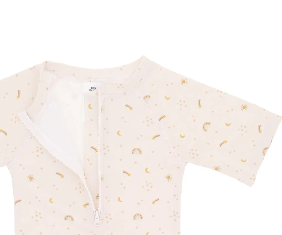 Los bañadores con cremallera delantera y preciosos estampados de las colecciones Verano Monnëka 2025 han sido confeccionados con una tela especial que protege la piel de los peques de los rayos solares.