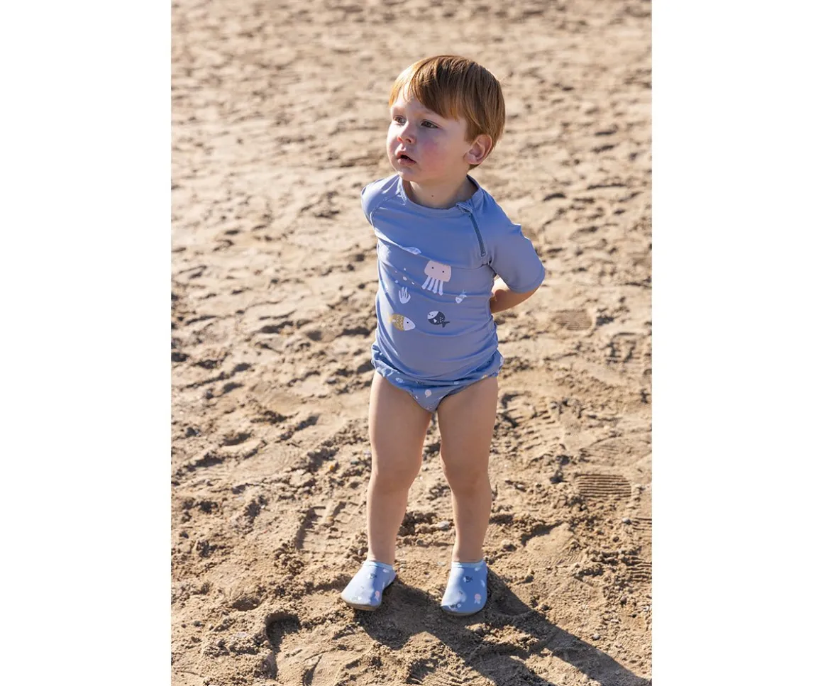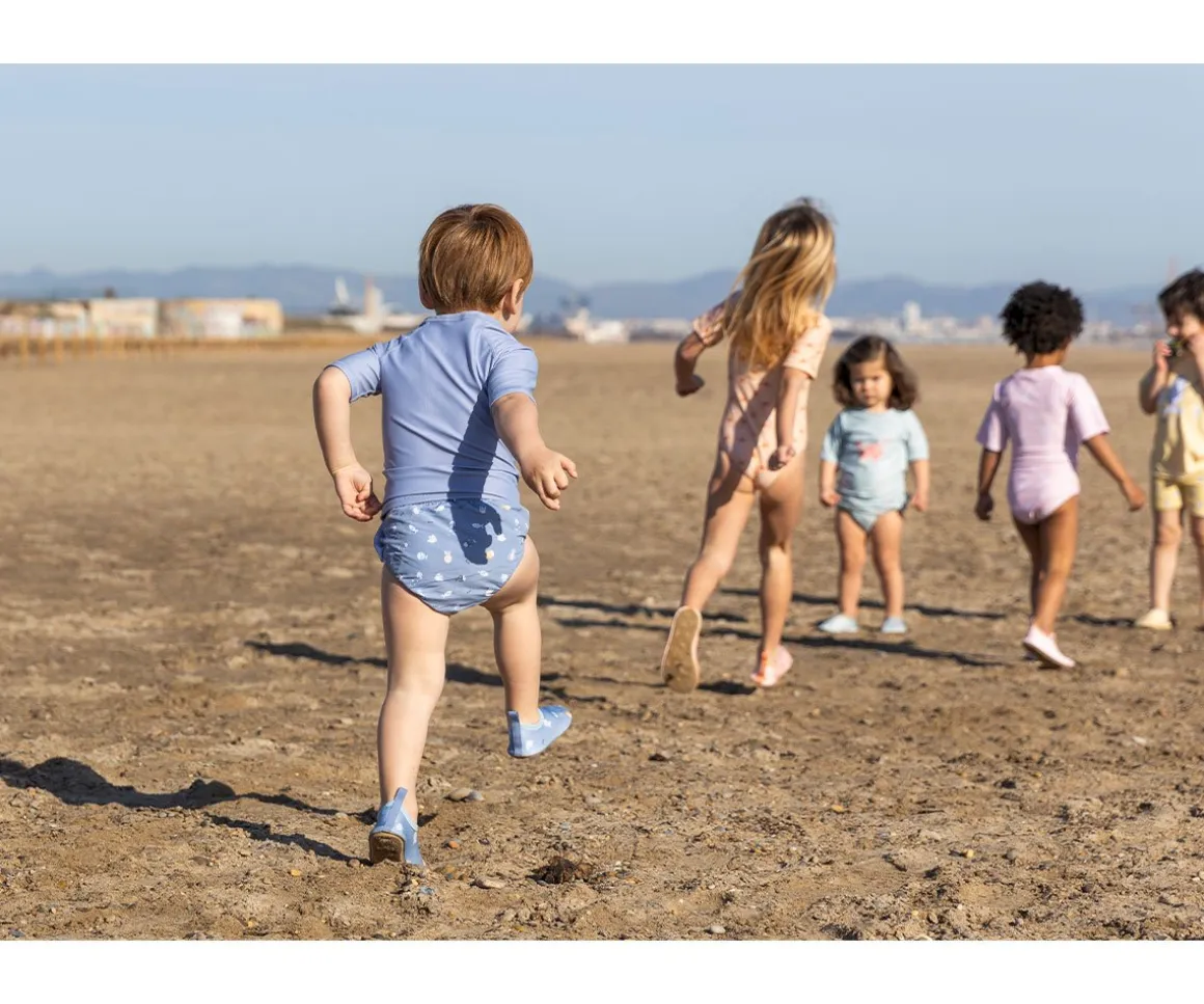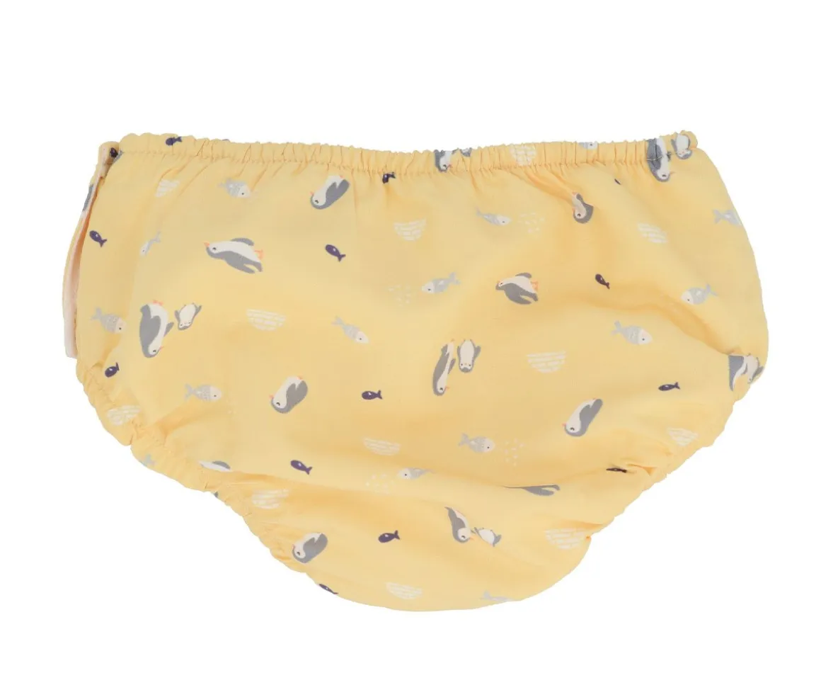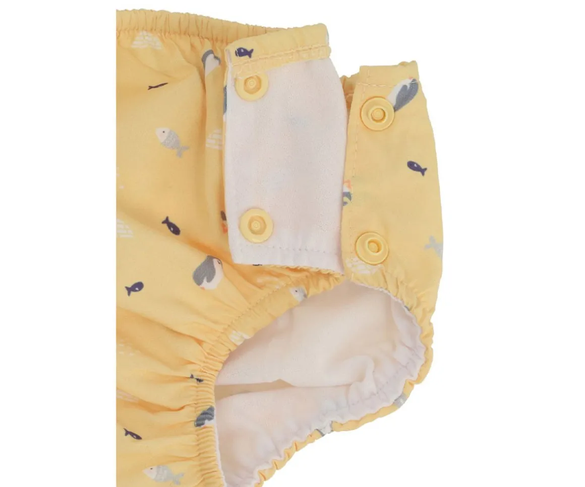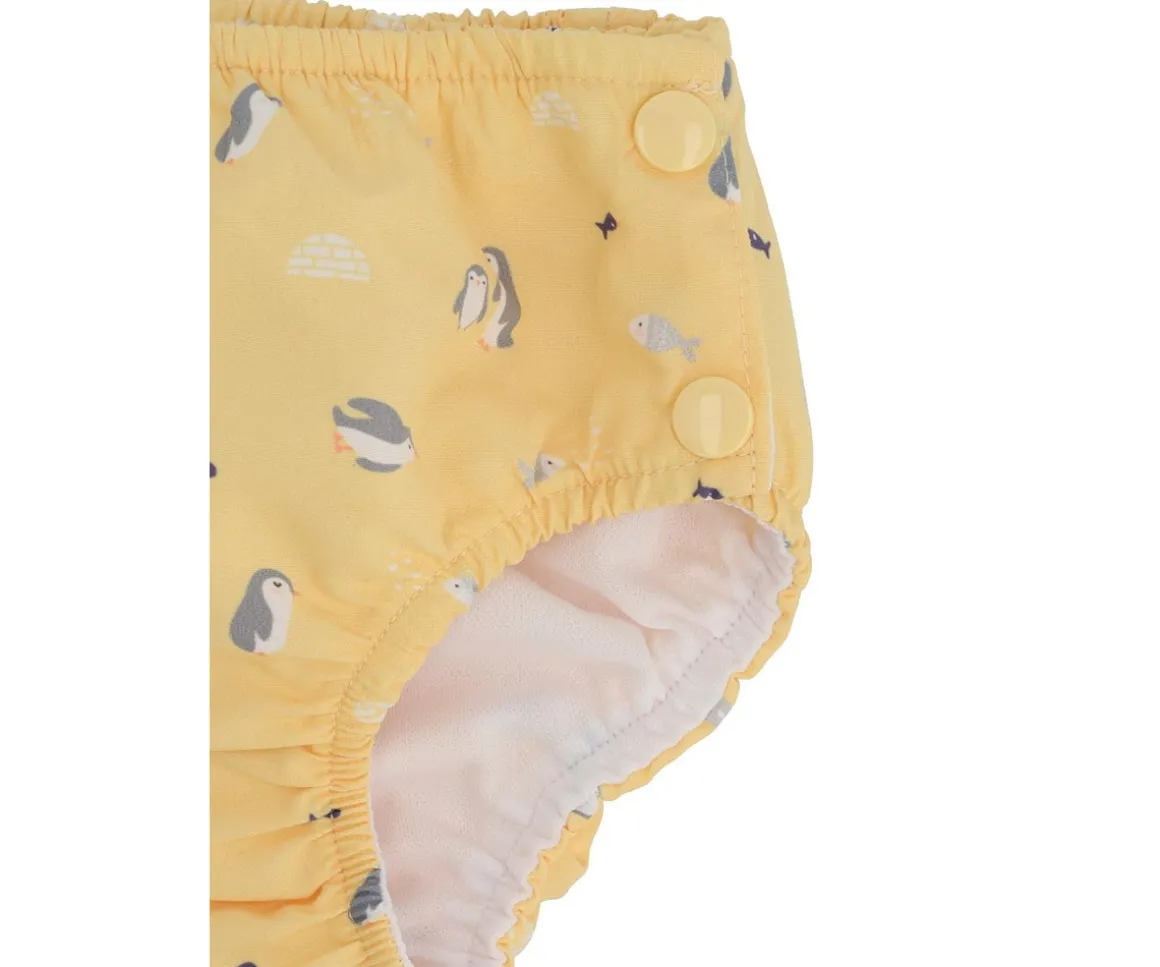 Bañador pañal de la colección Penguins de Monnëka que ha sido creado con una tela especial que protege a la piel de los rayos solares además que evita fugas sólidas cuando el peque se está bañañdo en la playa o la piscina.