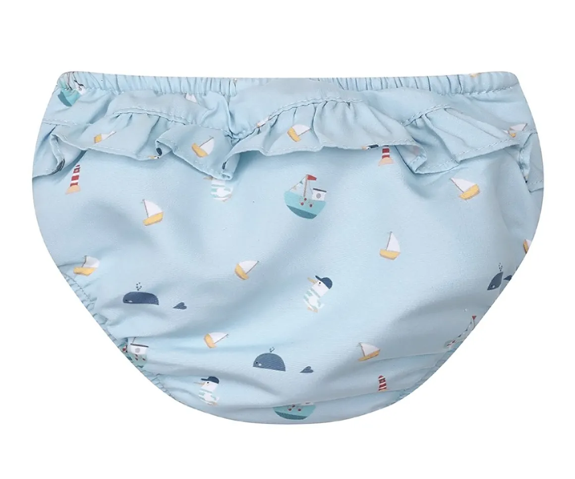 Los bañadores pañal con volantes de las colecciones de Verano Monnëka 2025 están fabricados con una tela especial que protege a la piel de los rayos solares además que evita fugas sólidas cuando el peque se está bañañdo en la playa o la piscina.