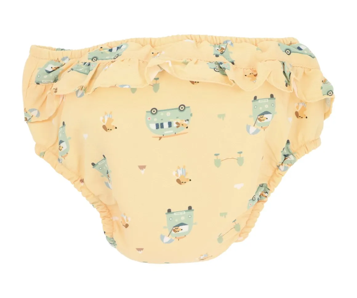 Los bañadores pañal con volantes de las colecciones de Verano Monnëka 2025 están fabricados con una tela especial que protege a la piel de los rayos solares además que evita fugas sólidas cuando el peque se está bañañdo en la playa o la piscina.