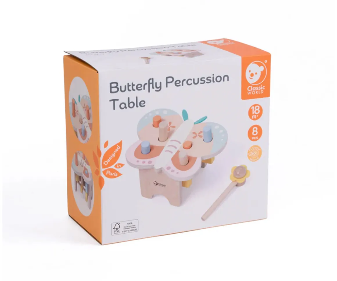 Este precioso banco de golpeo de madera con forma de mariposa viene con 4 clavijas de colores y un simpático martillo con forma de flor, perfecto para que las manos de los peques lo manipulen con facilidad.
