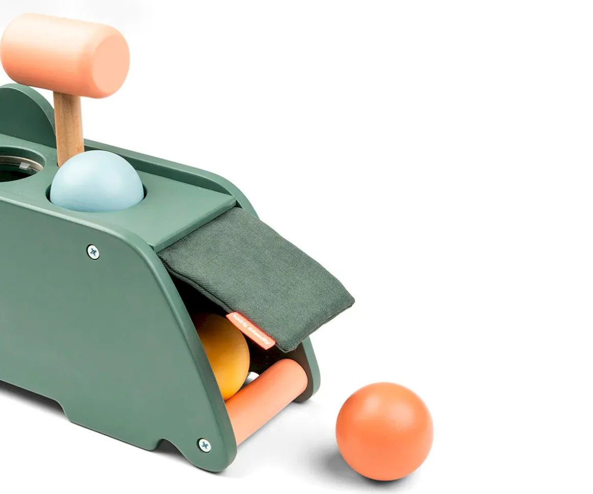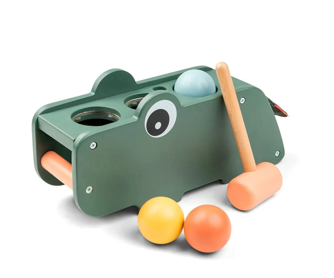 El banco de martillo de madera Croco estimula la coordinación ojo-mano y el sentido del oído cuando el niño golpea las bolas con el martillo.