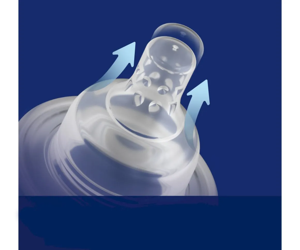 Equipado con tetina dinámica Super Vent, con conductos internos que regulan el flujo de la leche y la presión en la tetina.
