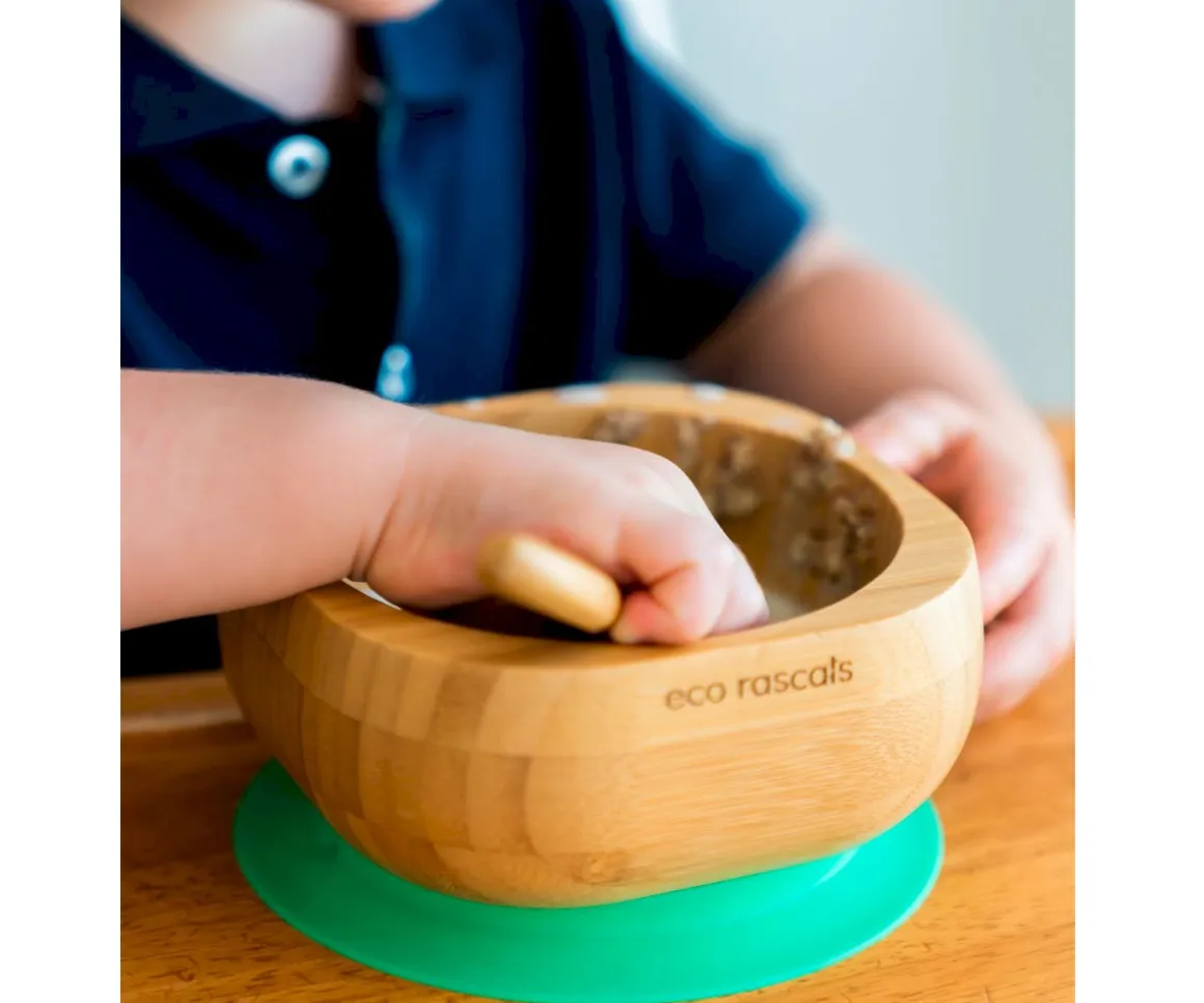 Bol de bambú orgánico con ventosa de silicona para que no se mueva de la mesa y cuchara de bambú con punta de silicona suave para las encias del bebé