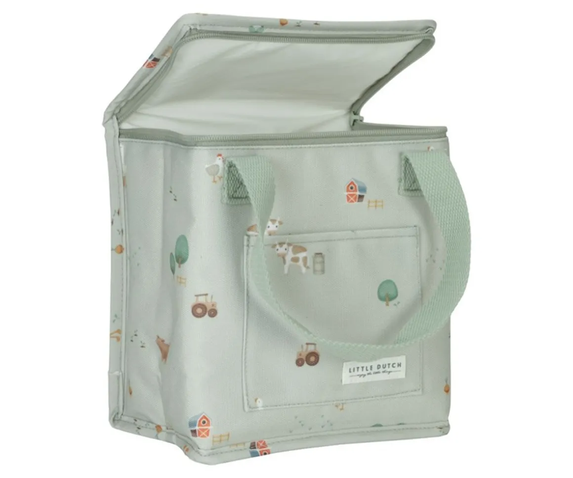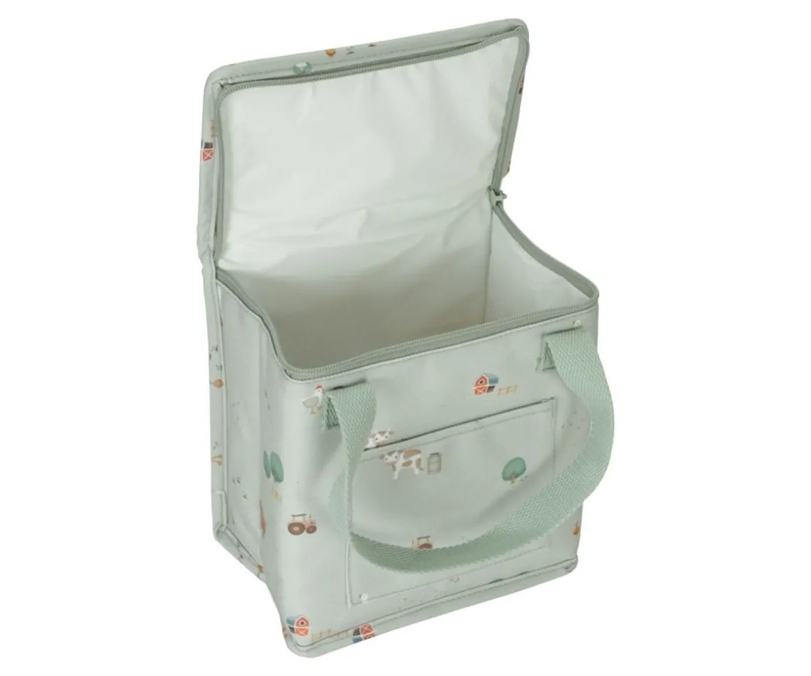 Preciosa bolsa para el almuezo isotérmica con diseño de los animales de la granja de Little Farm hecha de lona resistente fácil de llevar a todas partes gracias a sus asas.