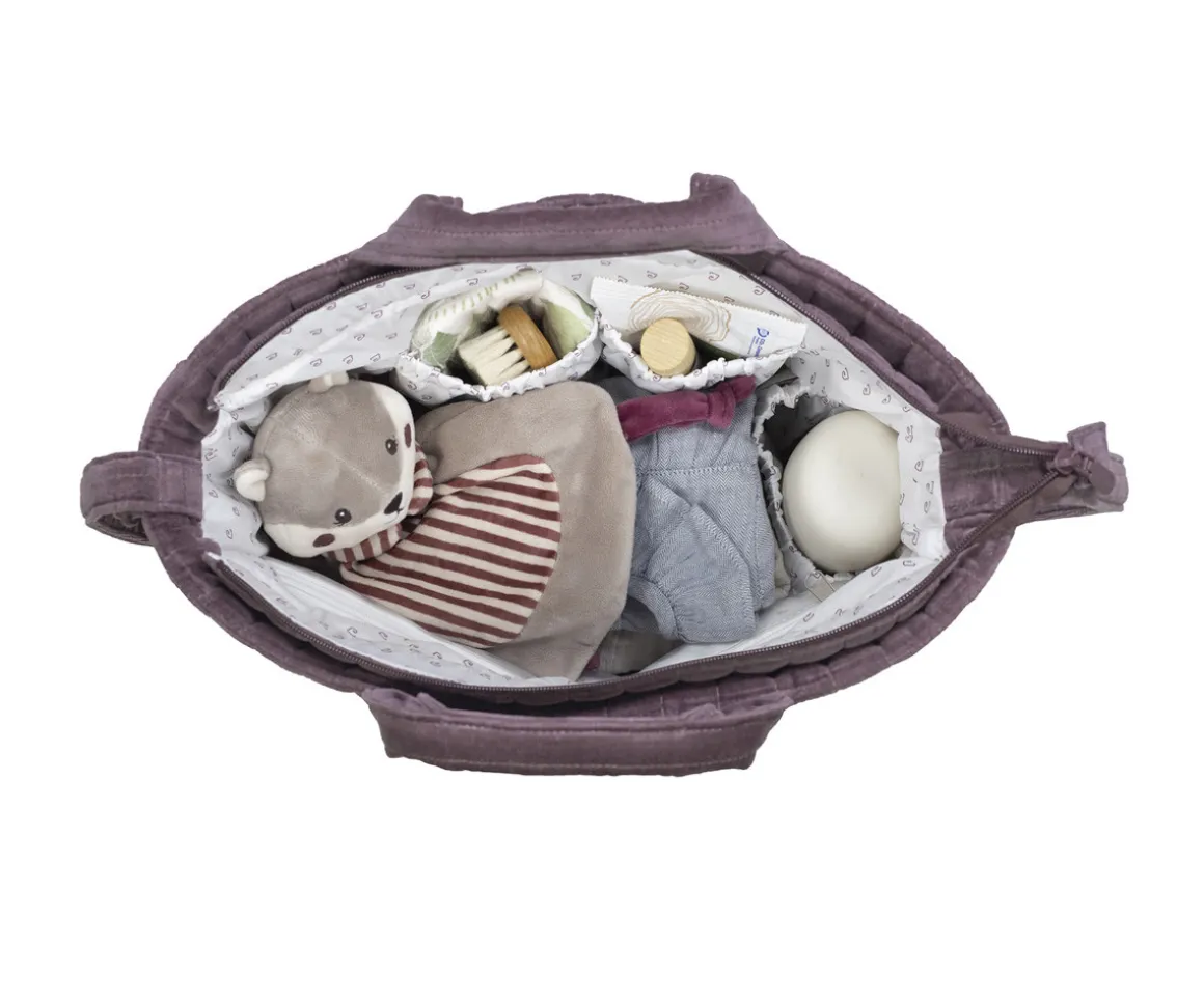 Elegante y práctica, la Bolsa Cherry Velvet está confeccionada en terciopelo de algodón 100% con tratamiento waterproof, ideal para organizar todo lo necesario del bebé mientras proteges tus objetos personales.