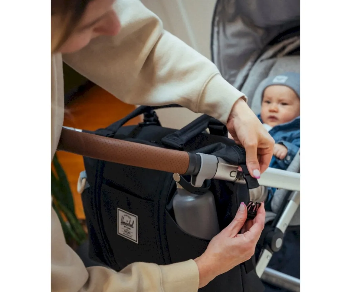 Es estupenda para llevar al hombro o en la mano gracias a sus asas cortas reforzadas, y muy cómoda para colocar en el carrito de tu bebé gracias a sus cierres de clip.