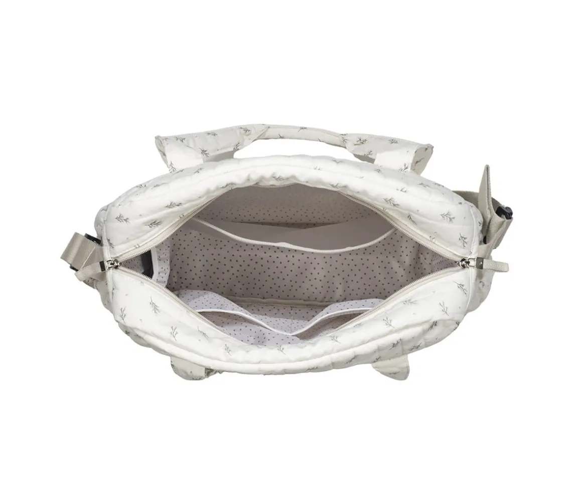 Confeccionada 100% en algodón con tratamiento waterproof, esta bolsa ofrece una gran capacidad para llevar todos los artículos esenciales de tu bebé cuando estás fuera de casa. Su diseño versátil incluye asas cortas de mano, asa larga para llevar al hombro y cortas con velcro para el cochecito.