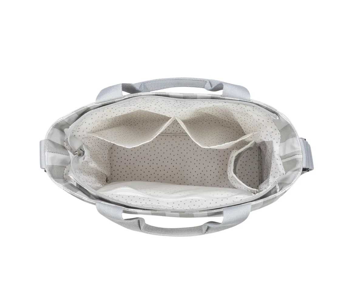 El bolso cambiador de Walking Mum con estampado de rayas, es ligero, resistente y de gran capacidad. Incluye cambiador para bebé y múltiples bolsillos: térmico para biberones, plastificado para ropa húmeda y otros de fácil acceso. Su sistema de sujeción universal y sus asas lo hacen práctico para cualquier silla de paseo. Ideal para tener todo lo necesario del bebé organizado durante los paseos.