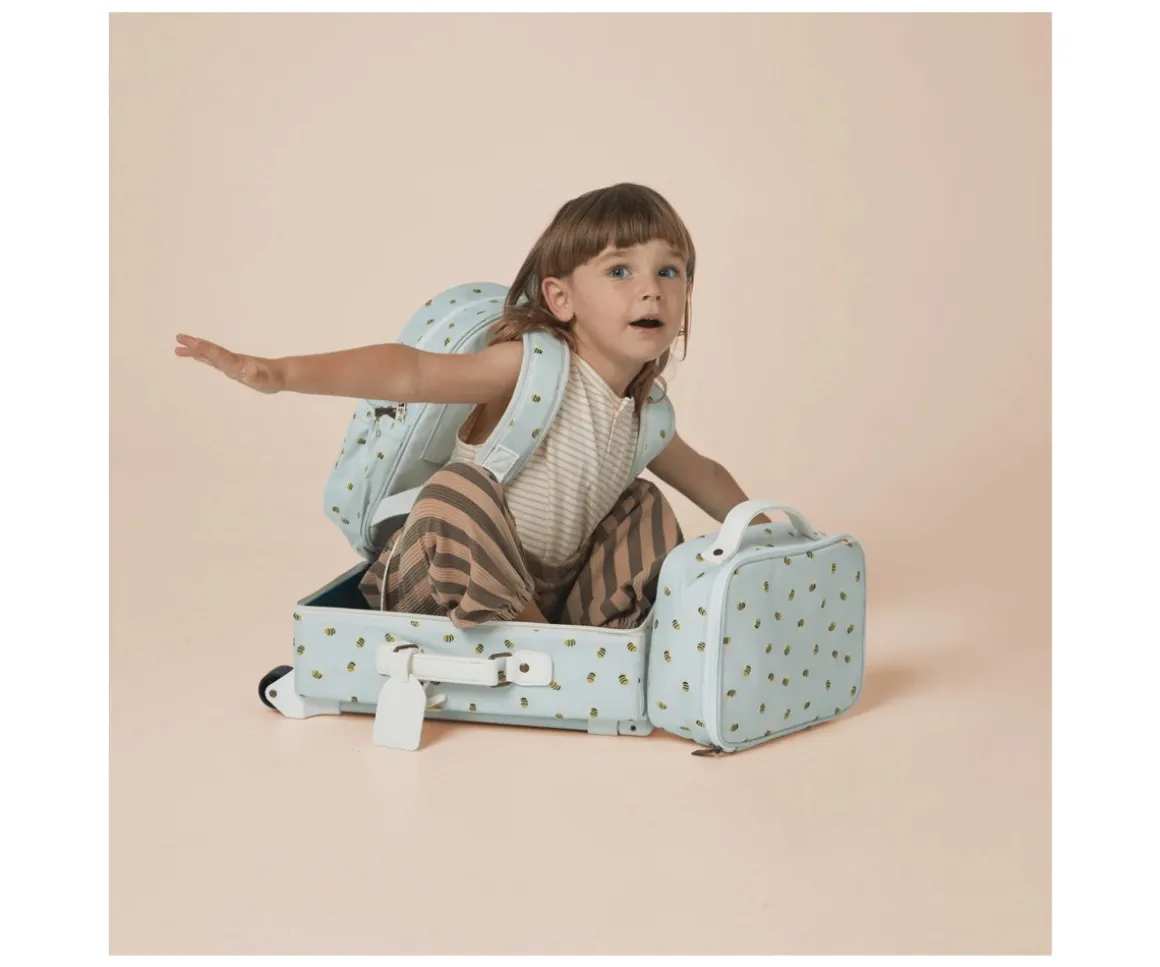 La bolsa térmica adornada con pequeñas abejas sobre un fondo azul cielo es perfecta para llevar al cole, de picnic o de excursión, tiene el tamaño ideal para las manos pequeñas y las grandes aventuras.