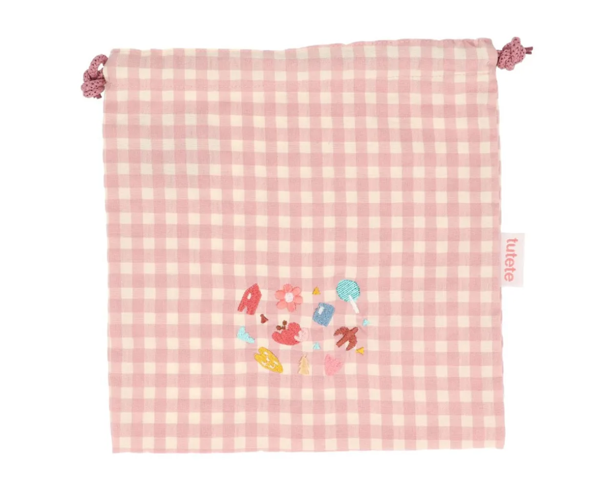 Las bolsas de merienda vichy de tela con cierre de cordón ajustable cuentan, en su parte delantera, con bordados de los personajes de la Vuelta al Cole Tutete 2025. Son la opción perfecta para que tu peque lleve al cole, la guardería o escuela infantil el almuerzo, merienda o pequeños snacks.