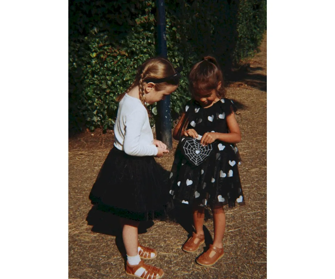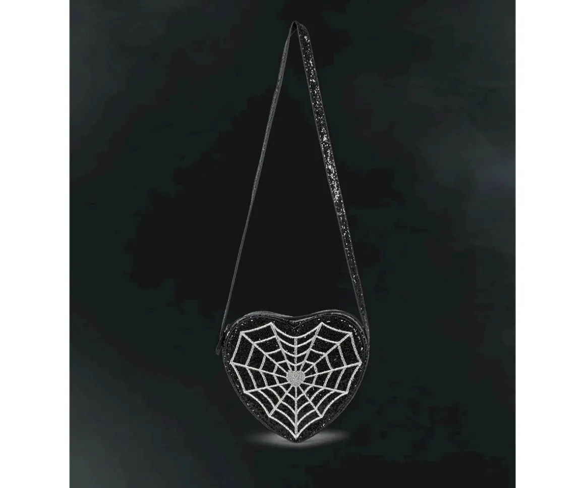 Cuenta con una fina correa para llevar al hombro y está decorado con purpurina y una telaraña en la parte frontal.