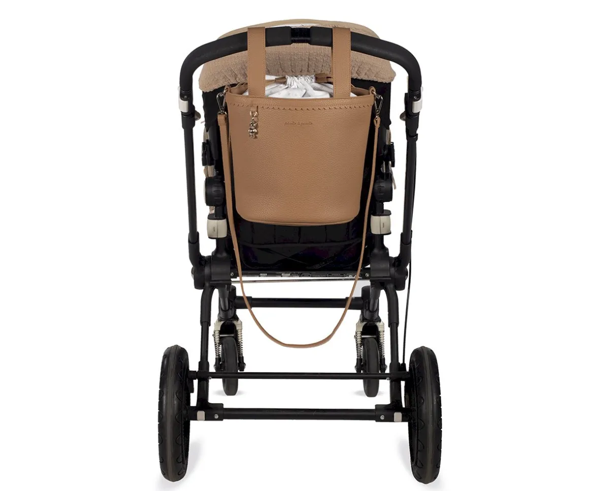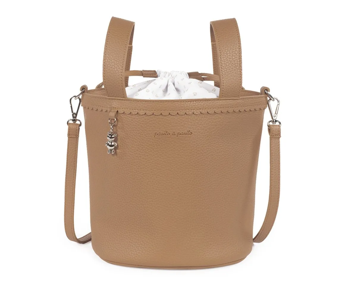 El bolso pequeño en forma de cubo Icon Caramel de Pasito a Pasito es ideal para llevar todo lo necesario durante el paseo del bebé, sujeto en el carrito ó colgado como un bolso convencional. Su resistente y delicada polipiel lo hace ligero y duradero, con amplio espacio en su interior y cierre mediante cordones para no perder nada.