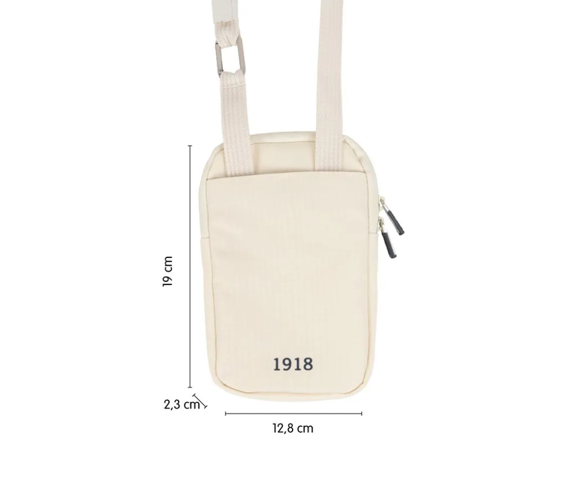 Bolso bandolera de tela de color beige con una asa regulable para llevar al hombro o cruzado. Ideal para llevar el móvil y lo imprescindible. Cuenta con un compartimento principal con cierre mediante cremallera que incluye un bolsillo interior y un pequeño mosquetón para llaves. Tiene dos bolsillos exteriores.