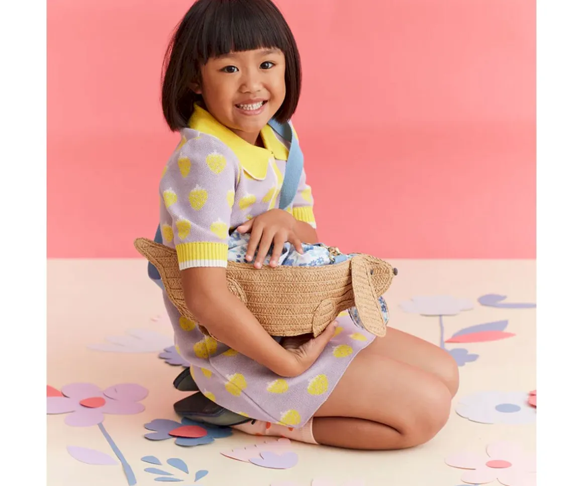 El bolso tejido con forma de perro salchicha de Meri Meri cuenta con orejas caídas, carita bordada, forro con cordón de polialgodón con estampado de flores y correa cruzada de tejido azul.