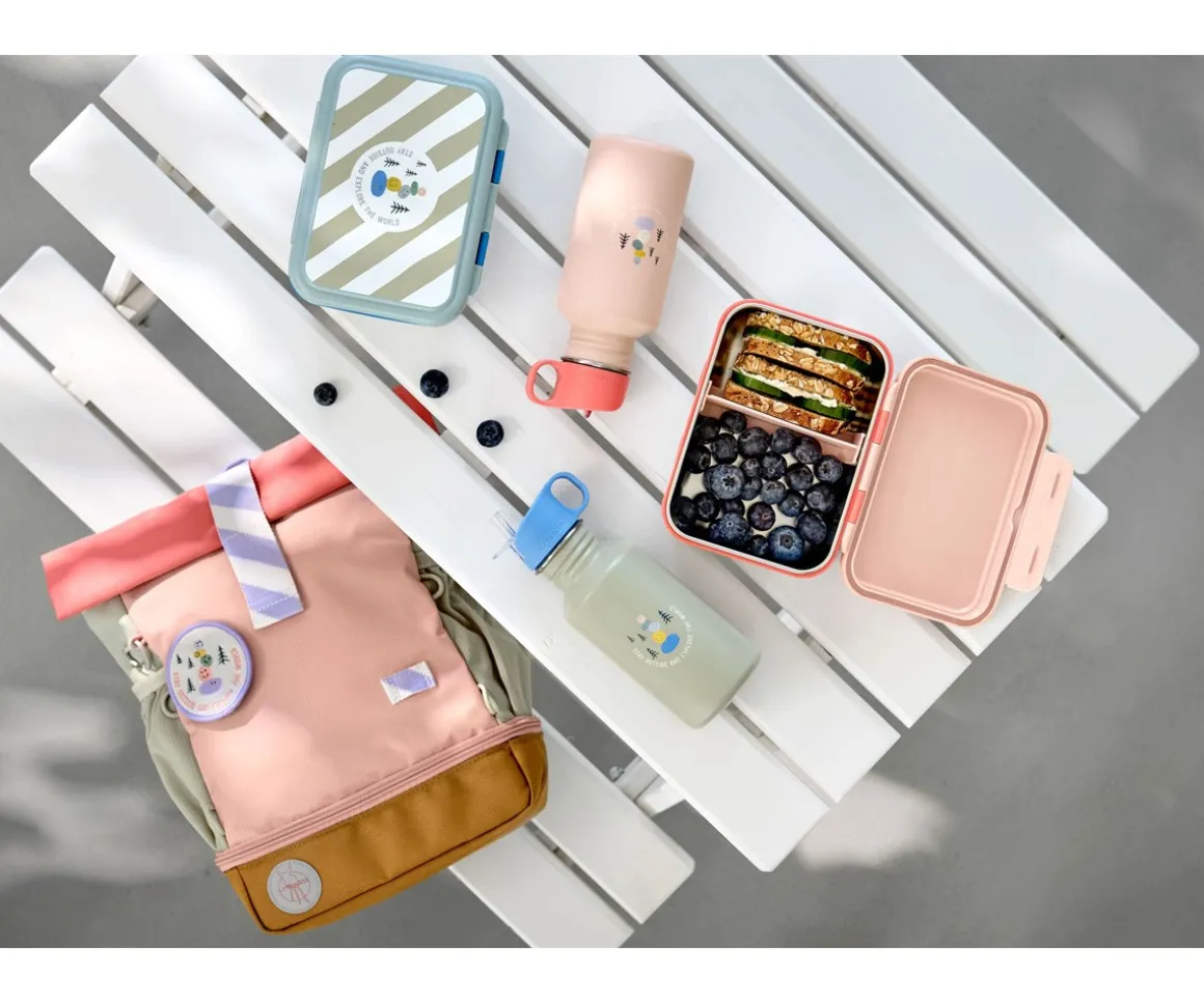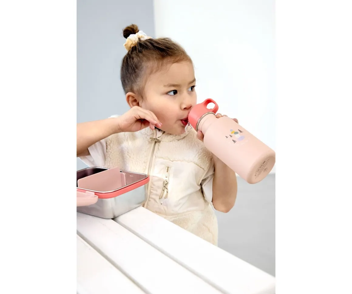 Botella de acero inoxidable de 500 ml de la colección Sunny Explorer de LÄSSIG, perfecta para el cole, excursiones o de viaje. Cuenta con tapón sport, a prueba de fugas, diseñada para que los más peques beban cómodamente y sin derrames.