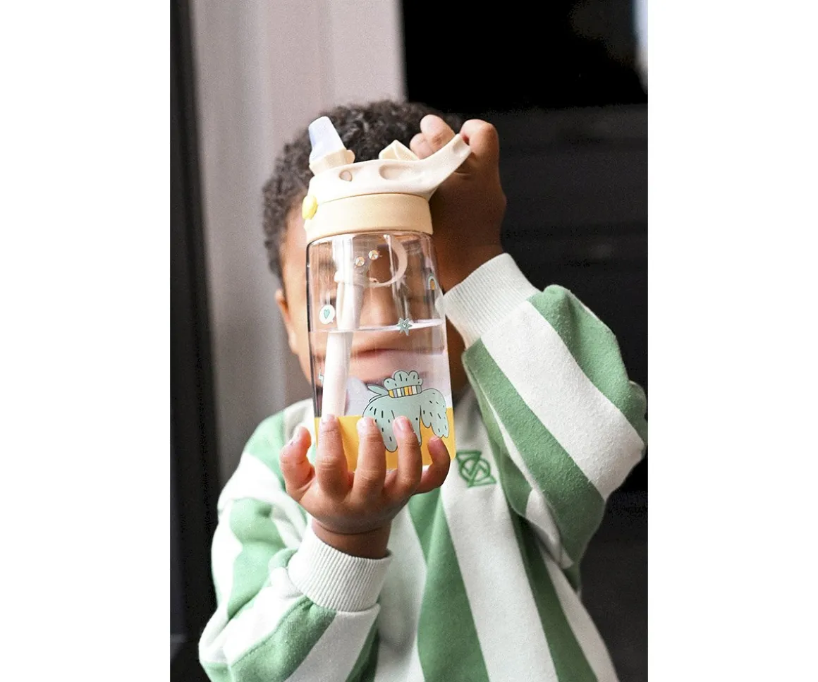 Botella fabricada en tritán resistente a impactos y con capacidad de 480 ml, perfecta para que los peques la lleven a todas partes y puedan beber agua de forma autónoma. Es a prueba de fugas y podrás meterla dentro de la mochila sin preocupaciones. Cuenta con un asa y una boquilla con pajita de silicona suave.