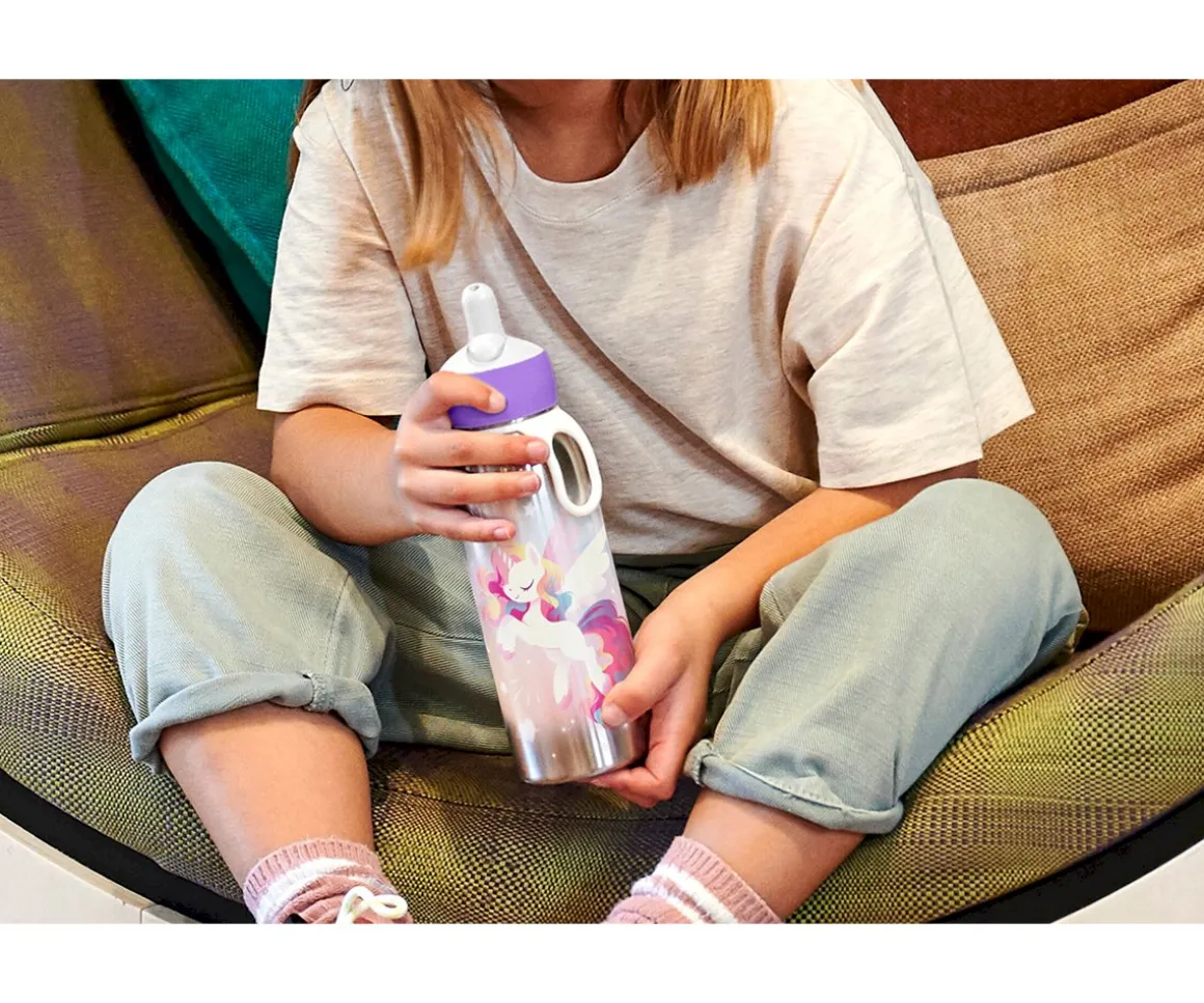 Esta botella de acero mantendrá la bebida de tu peque fresquita durante más tiempo. La botella tiene un práctico sistema abatible, fácil de usar incluso por los más pequeños. ¡Simplemente levante el pitorro y listo para beber! Cuenta con una pajita en el interior. Además, lleva un clip para poder colgarla del cinturón o en una bolsa. Esto evitará que la bolsa se moje si a alguna gota se le ocurre escapar de la boquilla después de beber.