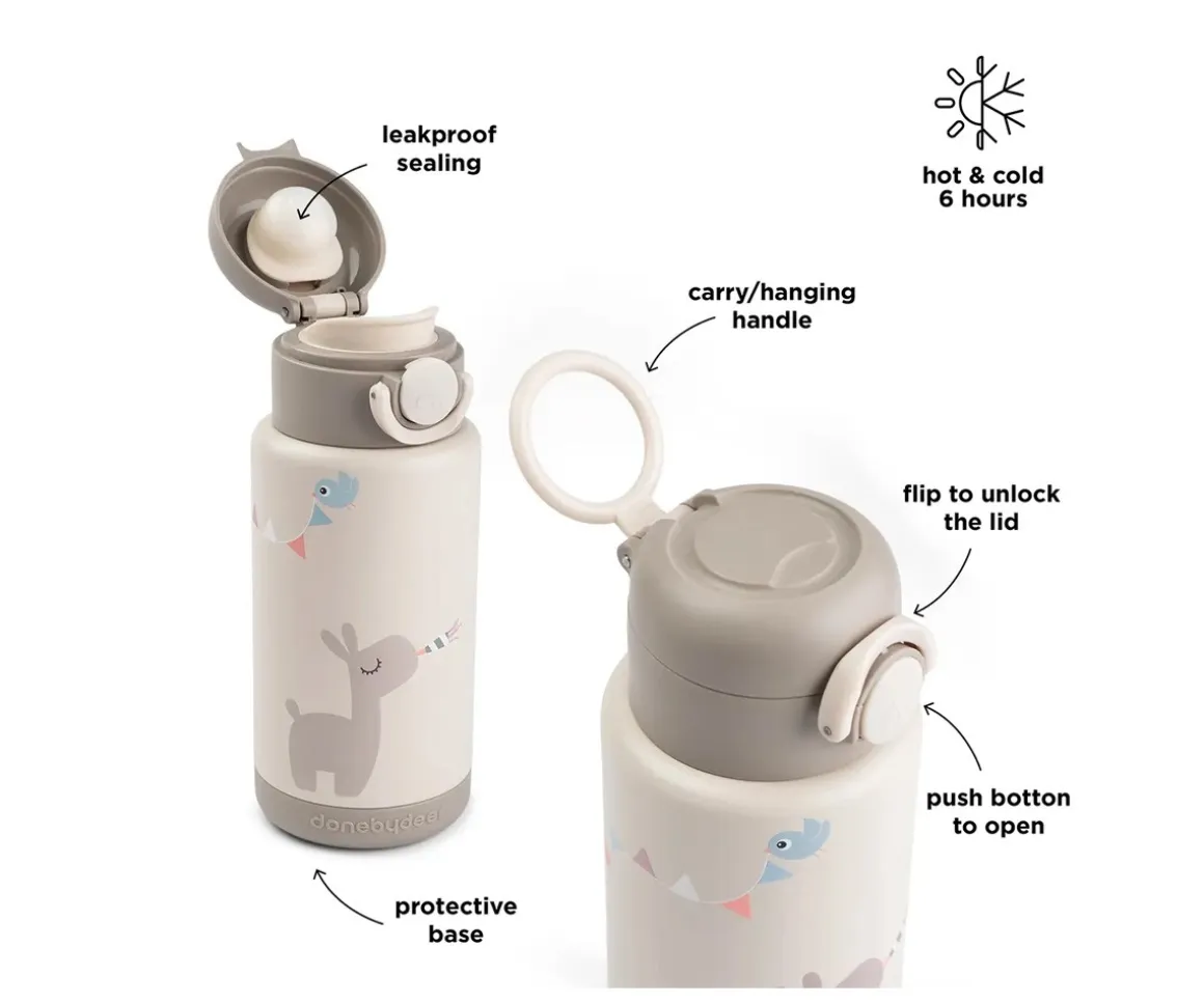 La nueva botella térmica de Done by Deer está hecha de acero inoxidable y mantiene la bebida fría o caliente hasta 6 horas.