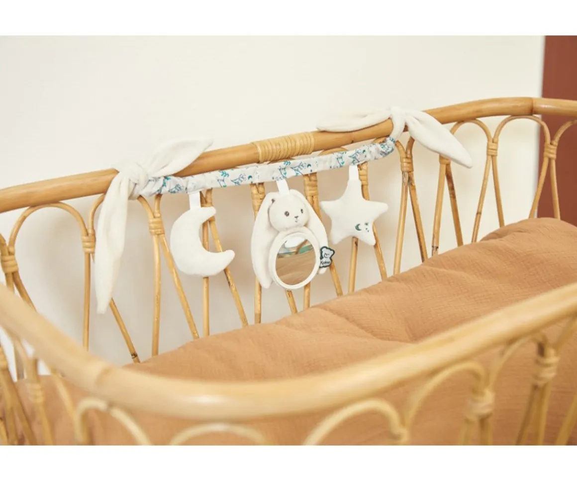 Este juguete de actividades estimula los sentidos con diferentes elementos colgantes: una luna que cruje, un pequeño conejo con espejo y un sonajero en forma de estrella. Gracias a las grandes orejas del conejo central, se puede colgar fácilmente en el cochecito o en la cuna.