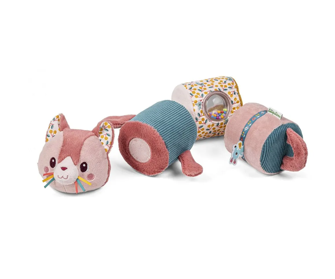 Este divertido juguete sensorial está formado por 4 cilindros blanditos. El primero es la cabecita del gatito Jeanne de Lilliputiens, el resto podrás unirlo con su velcro y formar una cadena de actividades que en su interior encontrarán sonidos estimulantes.